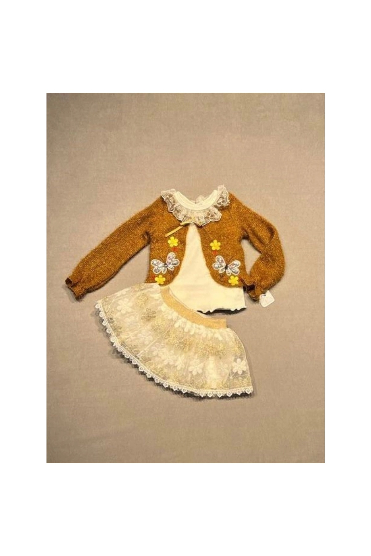 1-2-3 Yaş Brode Etekli Örme Hırkalı Uzun Kollu Sweat 3lü Kız Çocuk Takımıhediye paketi yapılabilir