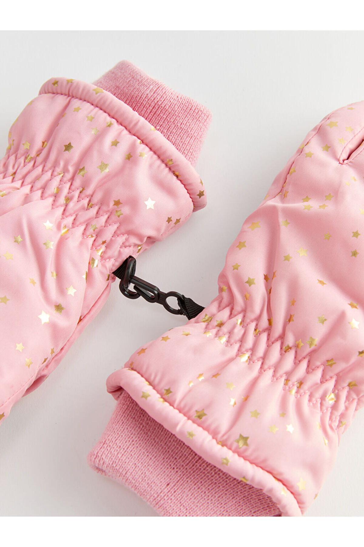 Yıldız desenli kız çocuk kayak eldiveni, ribana manşetli ve bileği lastiklidir.