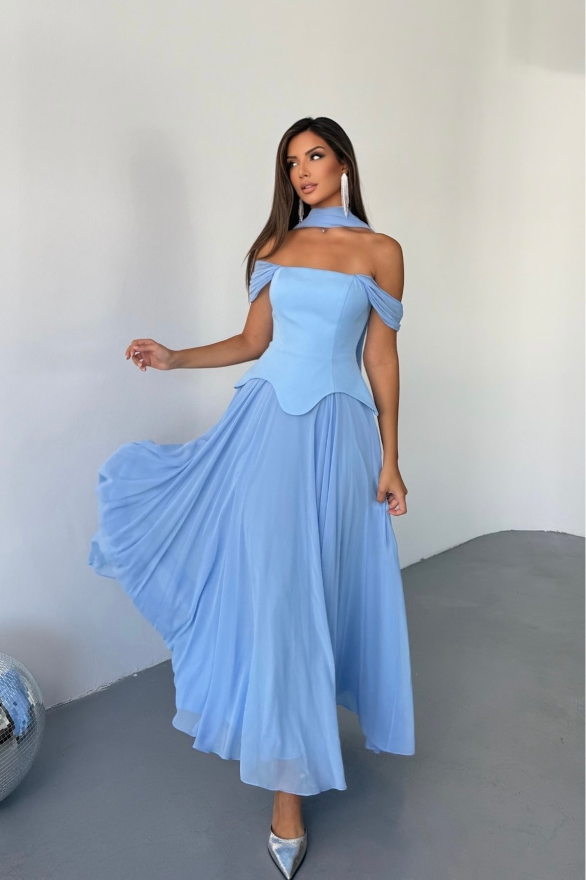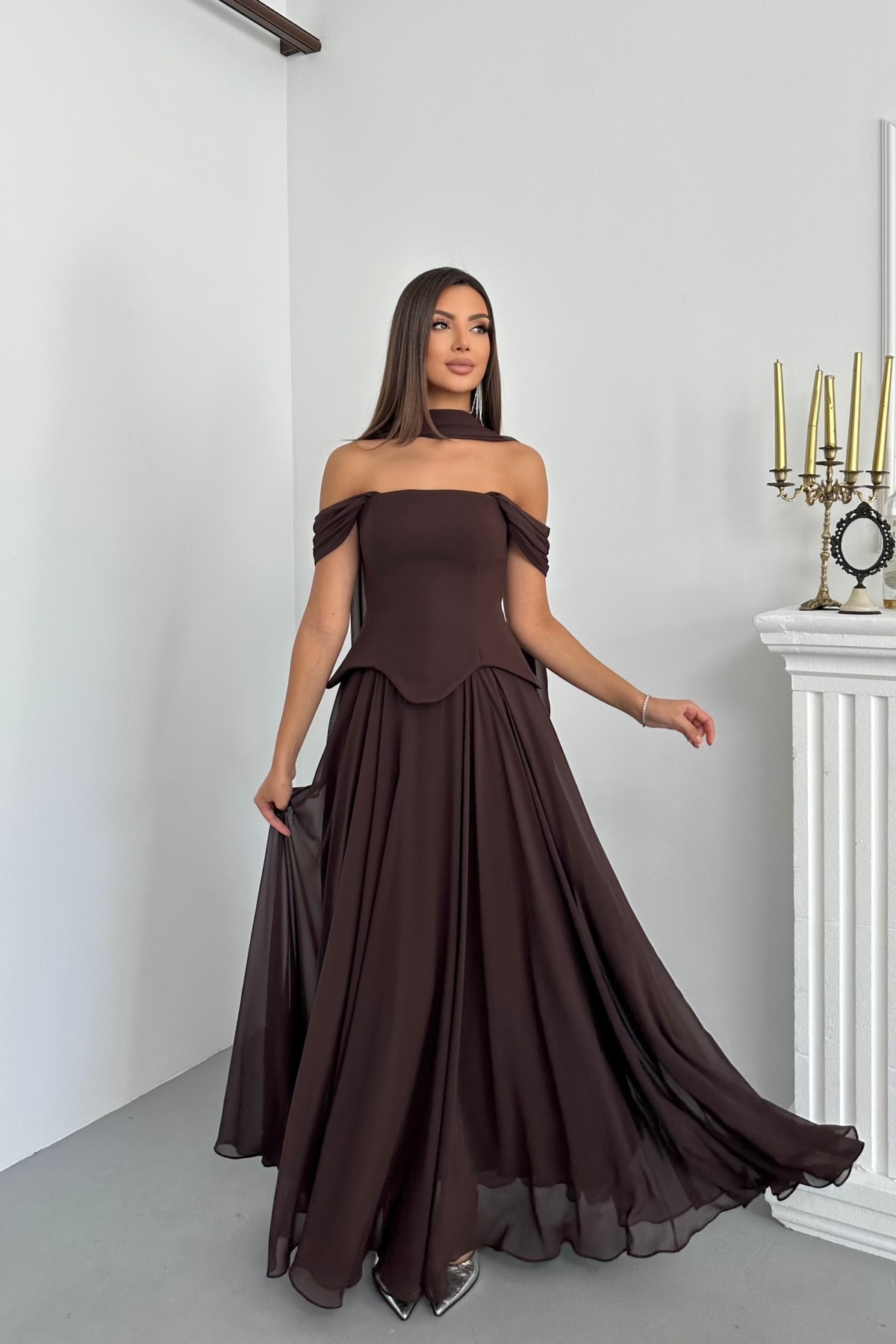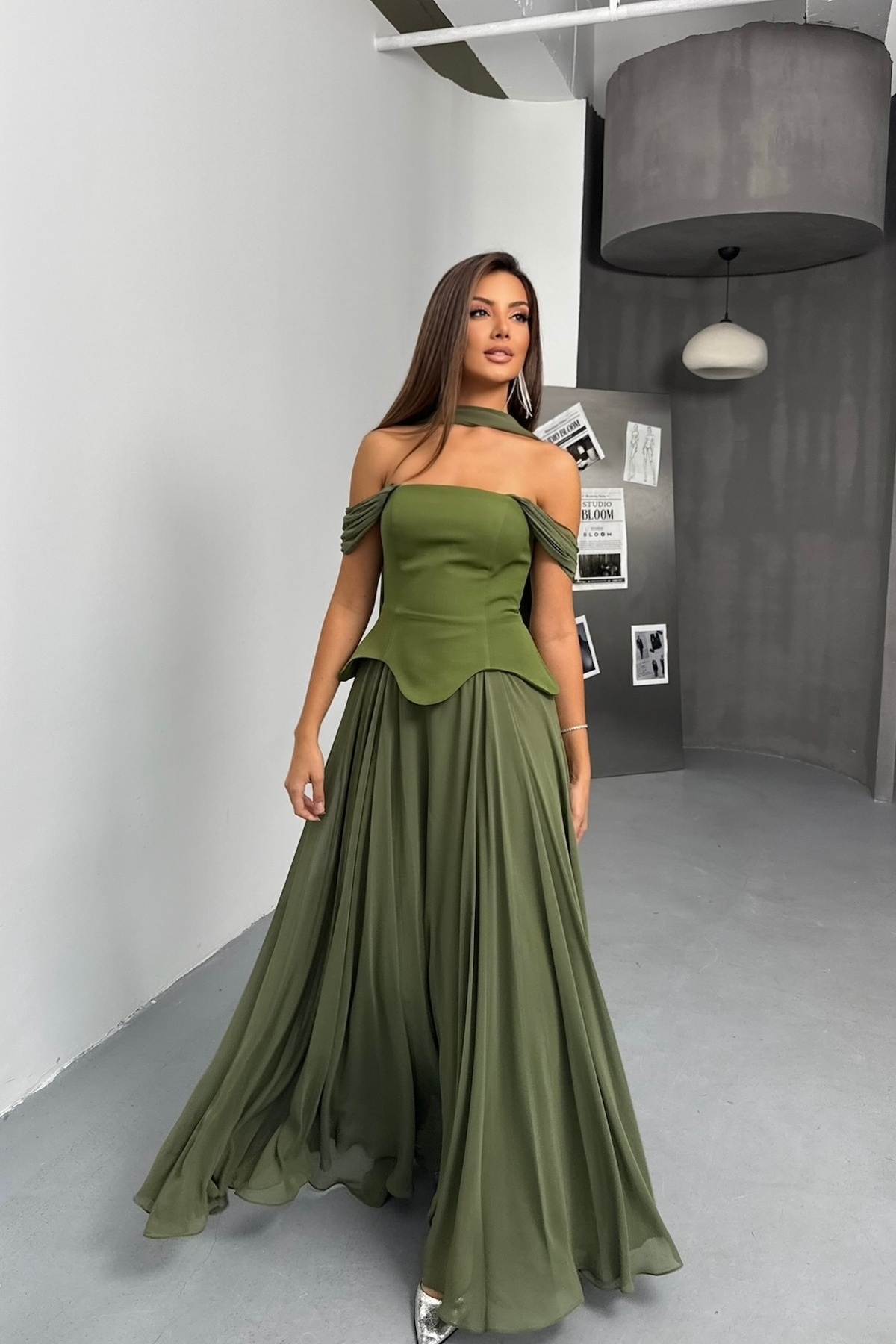Şallı Ve Takım Görünümlü Düşük Omuz Krep Şifonlu Abiye Elbise Dar Kalıp