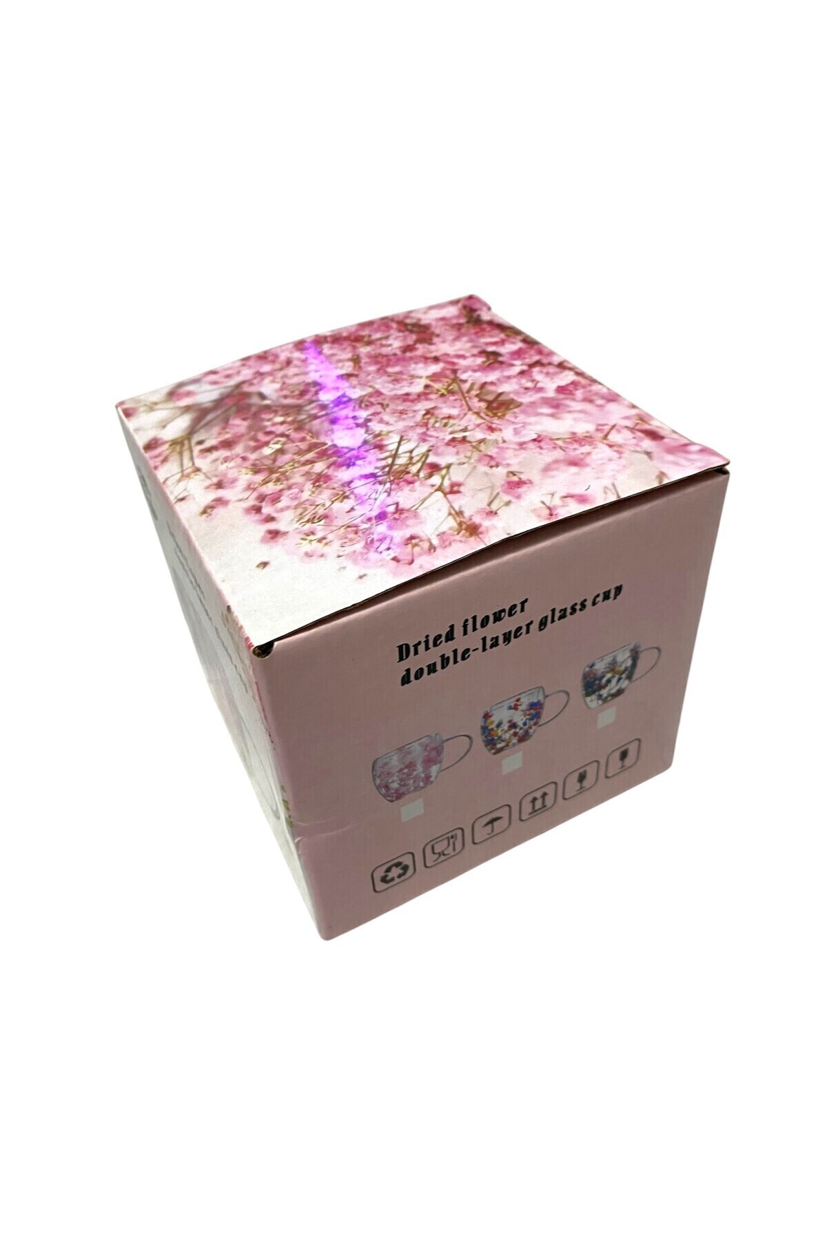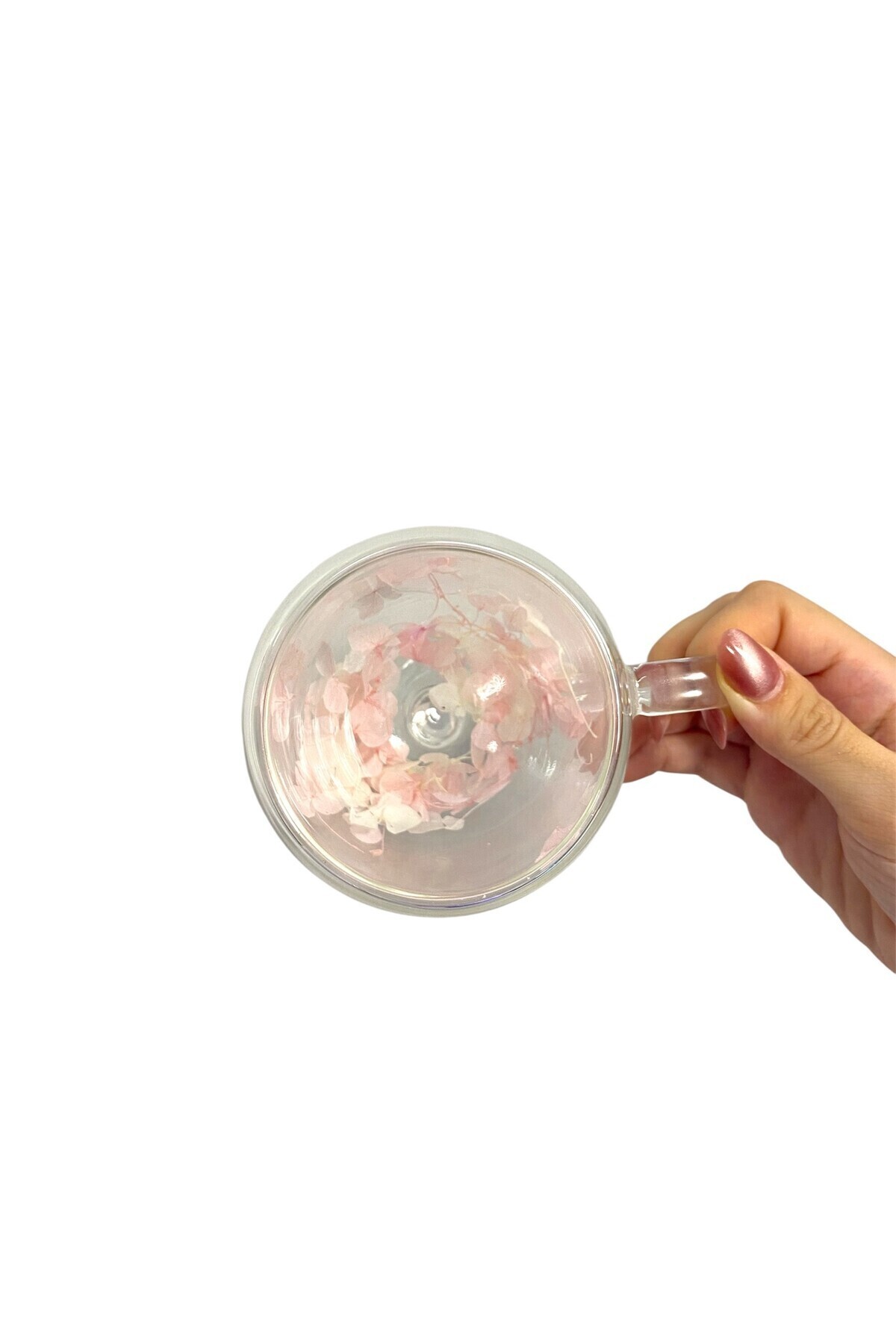 🌸 🌸 Çift duvarlı bardağın içinde gerçekçi pembe kuru çiçek detayları bulunur.