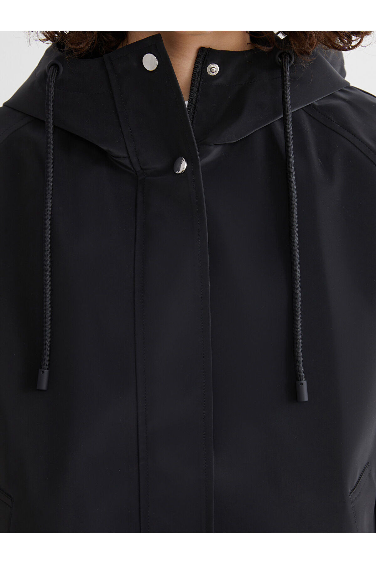 Kapüşonlu uzun kollu kadın yağmurluk, deri görünümlü kumaştan üretilmiştir.