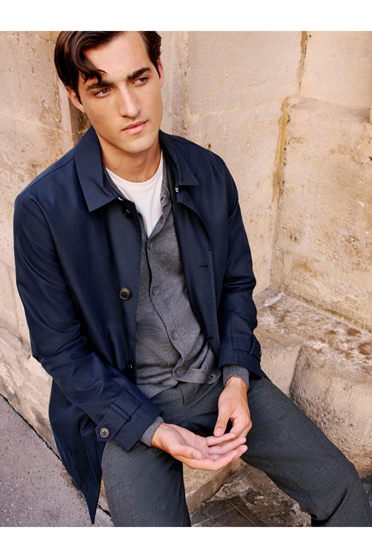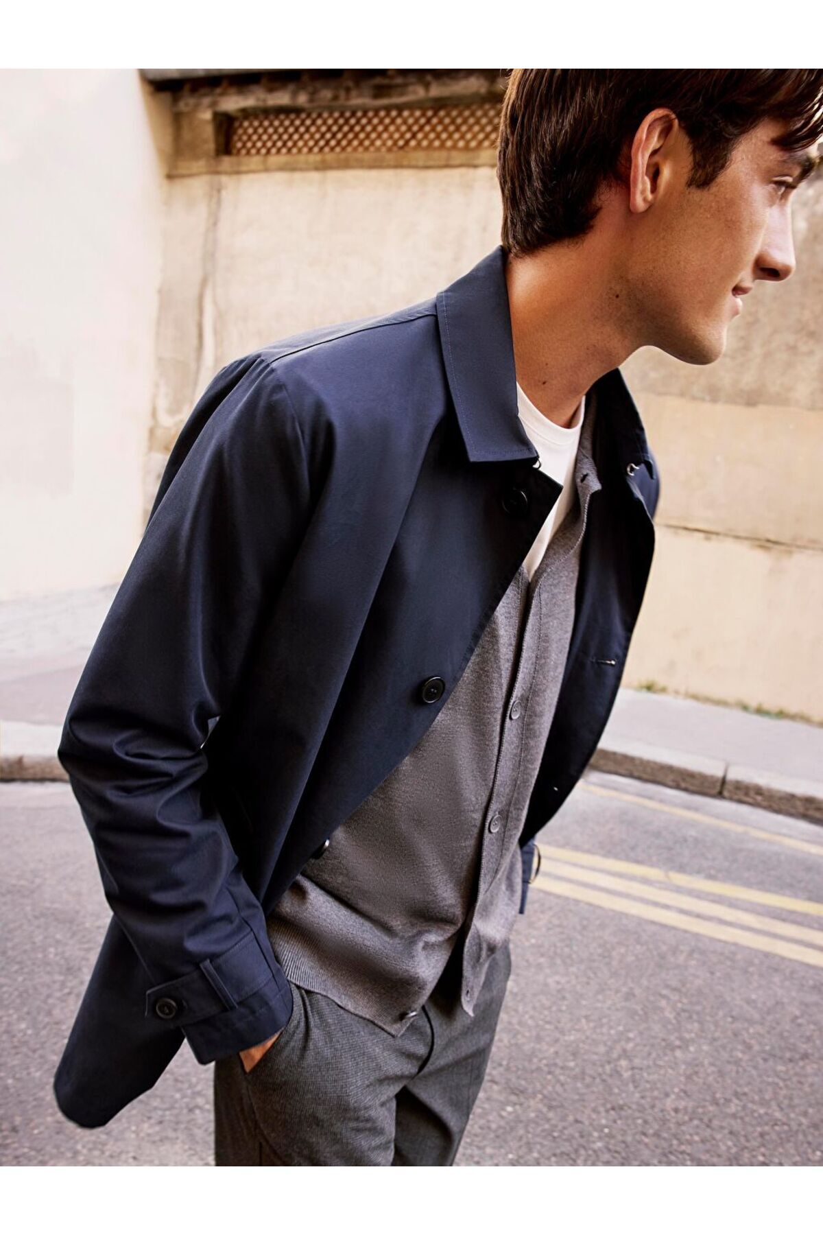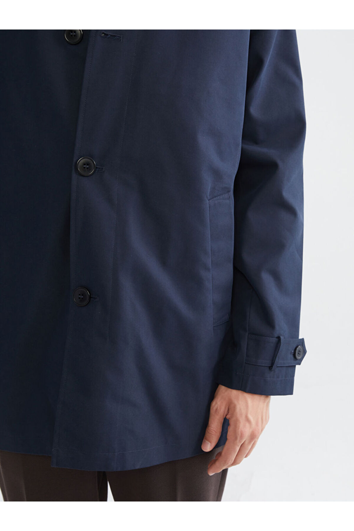 Standart kalıpta ve ceket yaka olarak tasarlanan erkek trençkot, sentetik kumaştan üretilmiştir.