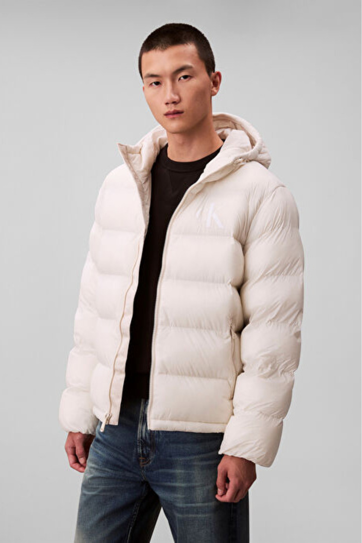 Logo: Göğüste CK monogram detayı — sade ve tanınabilir bir marka vurgusu.