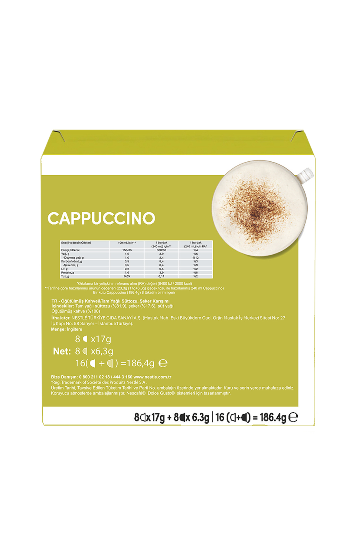 Bir cappuccino 3 şeyle tanımlanır: eşit miktarda buharlanmış süt ve yoğun, kadifemsi süt köpüğü içeren lezzetli bir espresso bazı. Her NESCAFÉ® Dolce Gusto® Cappuccino kapsülü, bir düğmeye dokunarak üçünün ideal dengesini bir araya getirir. Yoğun lezzetli bir espresso için birinci sınıf Arabica ve Robusta çekirdeklerinin bir karışımından ve o özel süt köpüğü kapağı için mükemmel tarifi içeren süt kapsüllerinden yapılan her NESCAFÉ® Dolce Gusto® Cappuccino, dünya çapında sevilen İtalyan klasiğine saygı duruşunda bulunur.