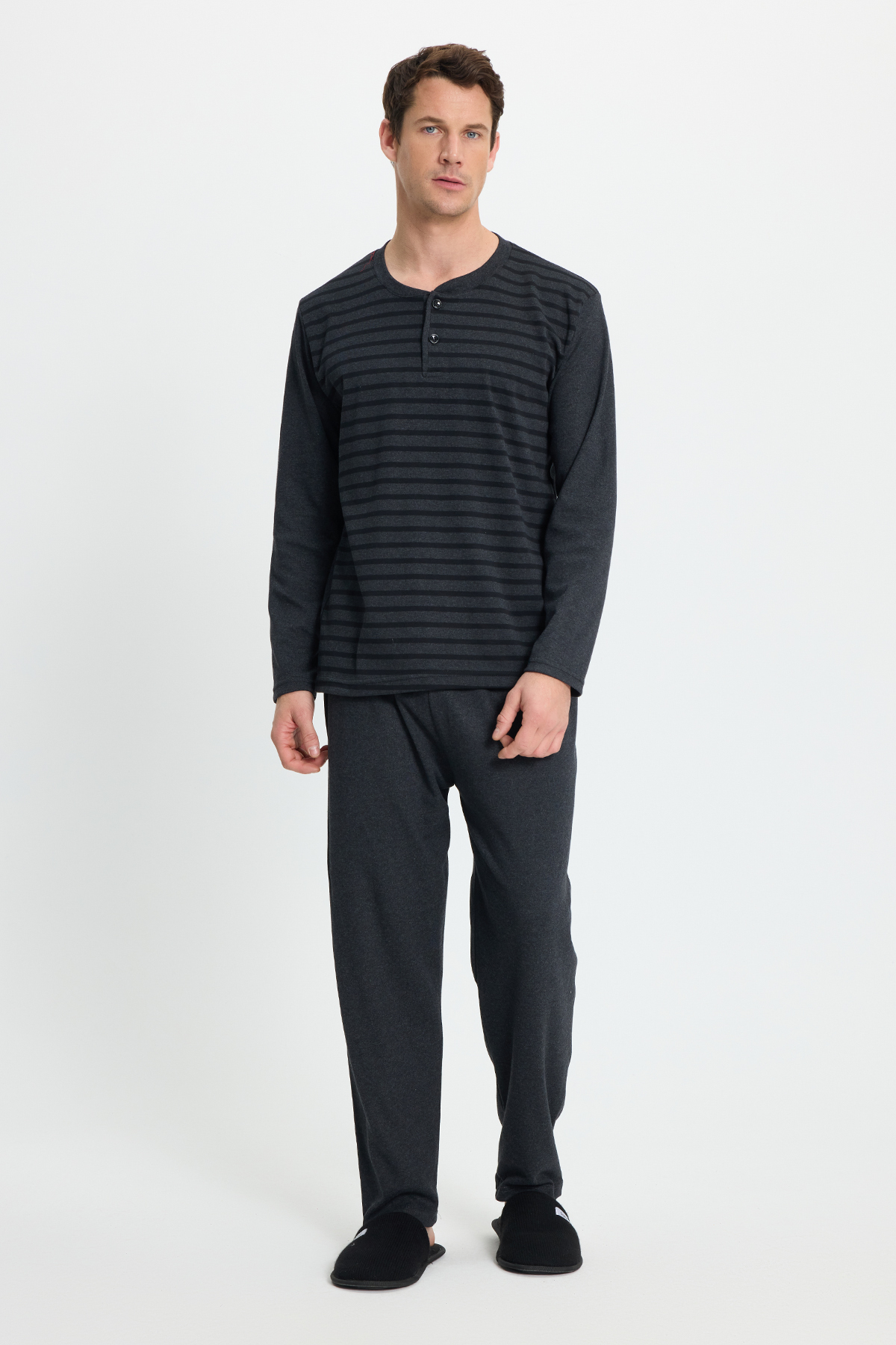 Erkek Regular Fit Pamuklu Düğmeli Yaka Beli Lastikli Desenli Antrasit Pijama Takımı