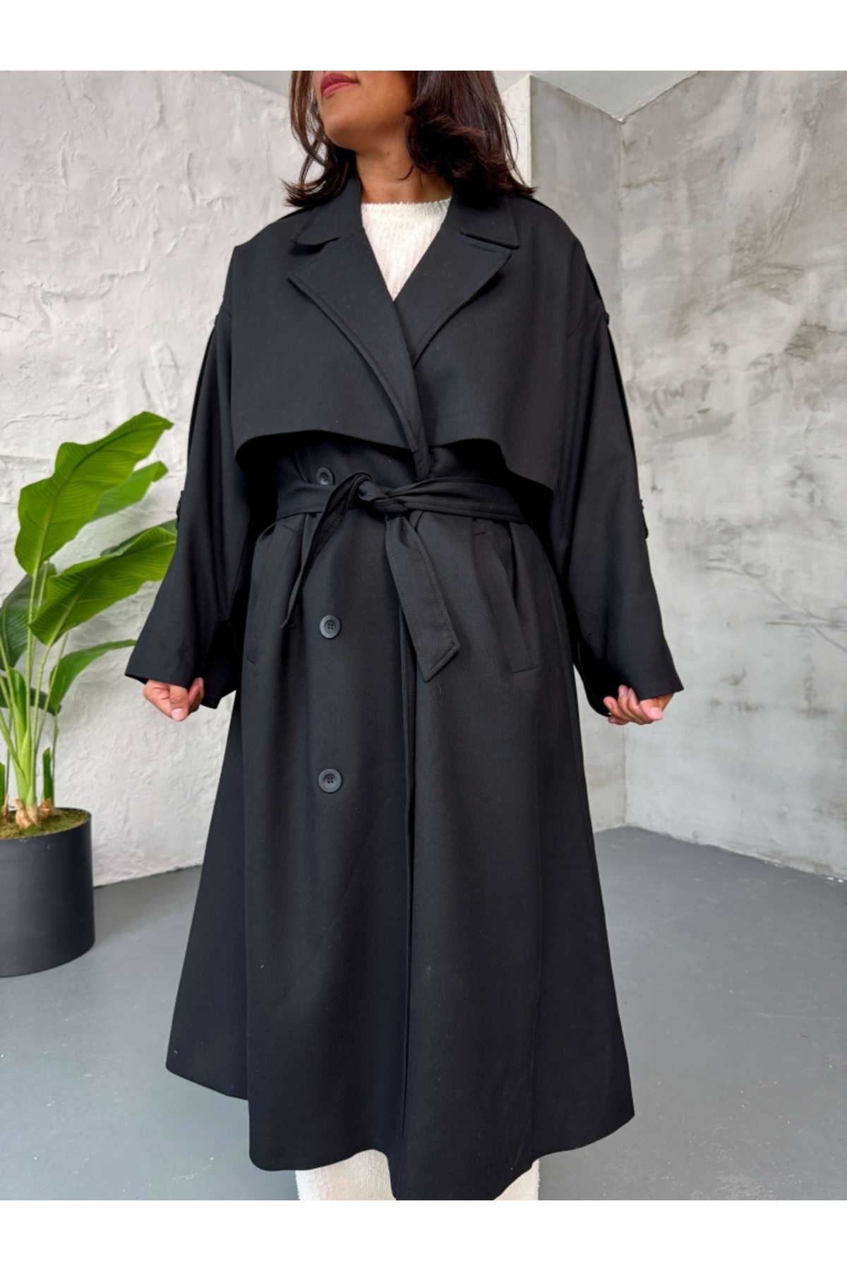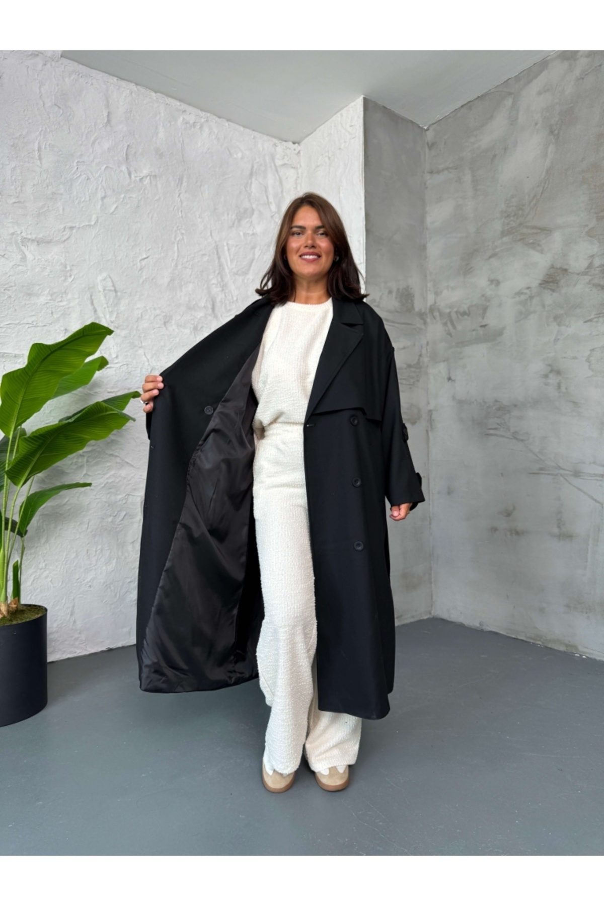 Siyah Kruvaze Detaylı Oversize Trençkot