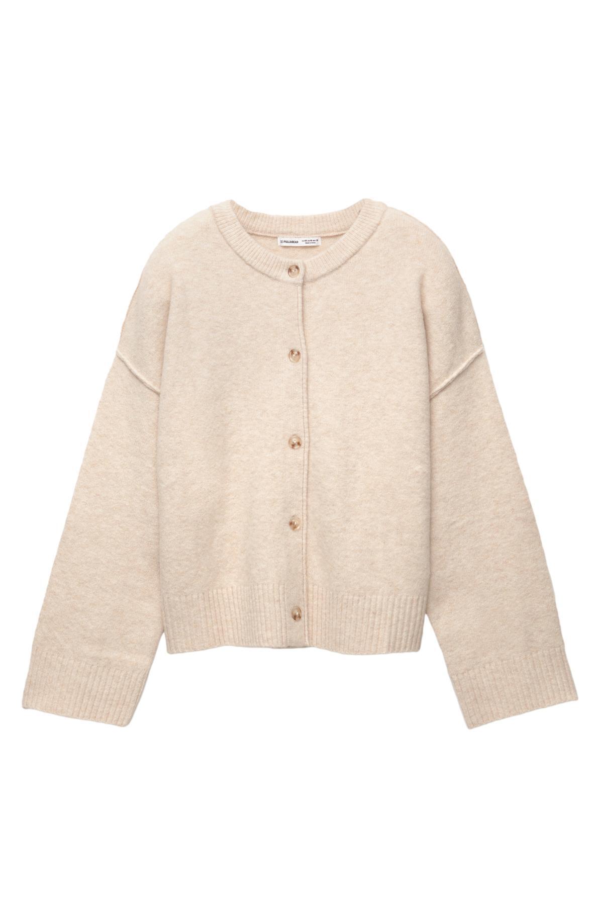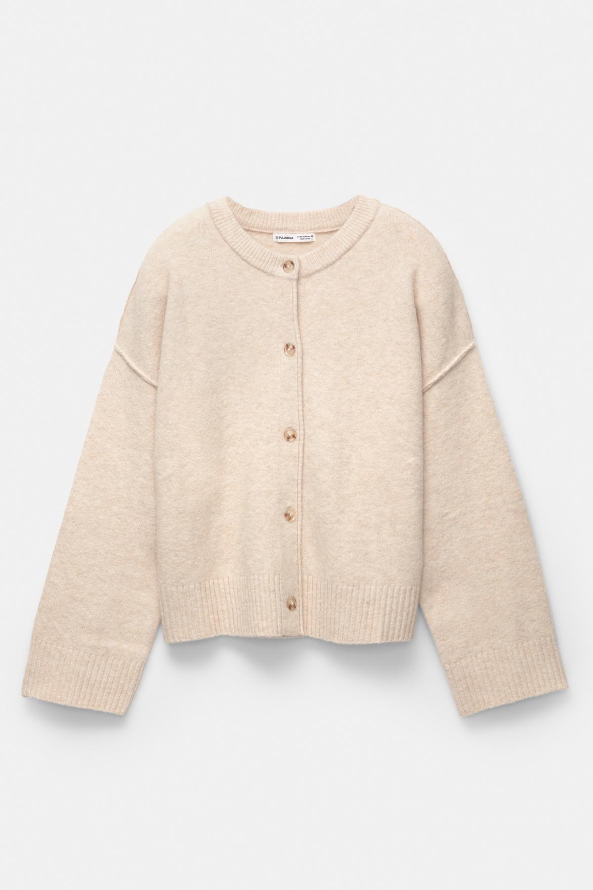 Önden düğme kapamalı ve uzun reglan kollu, soft örgü hırka.