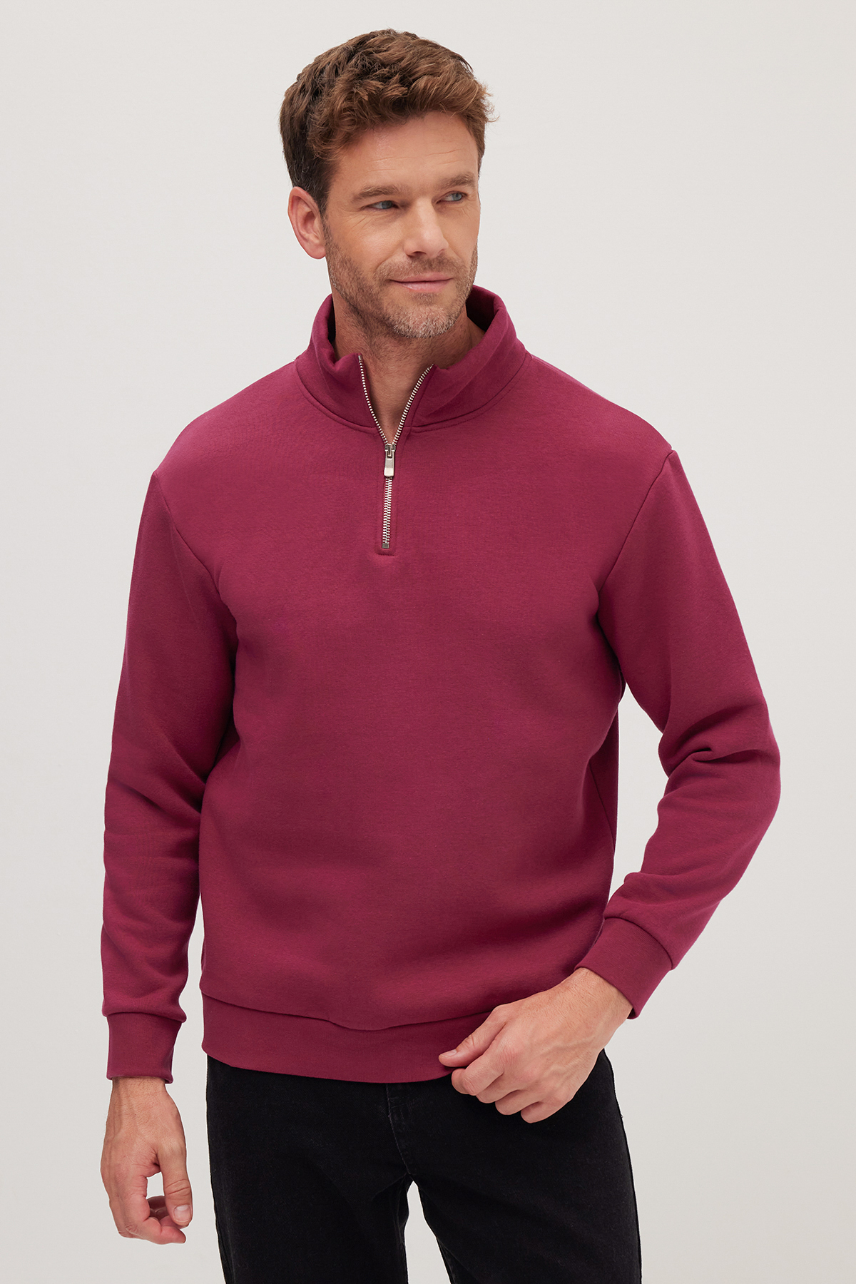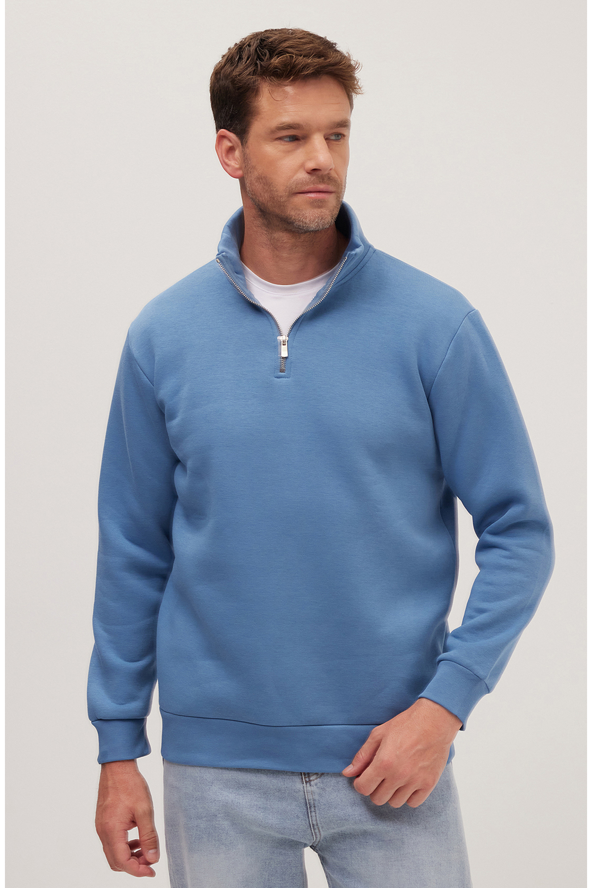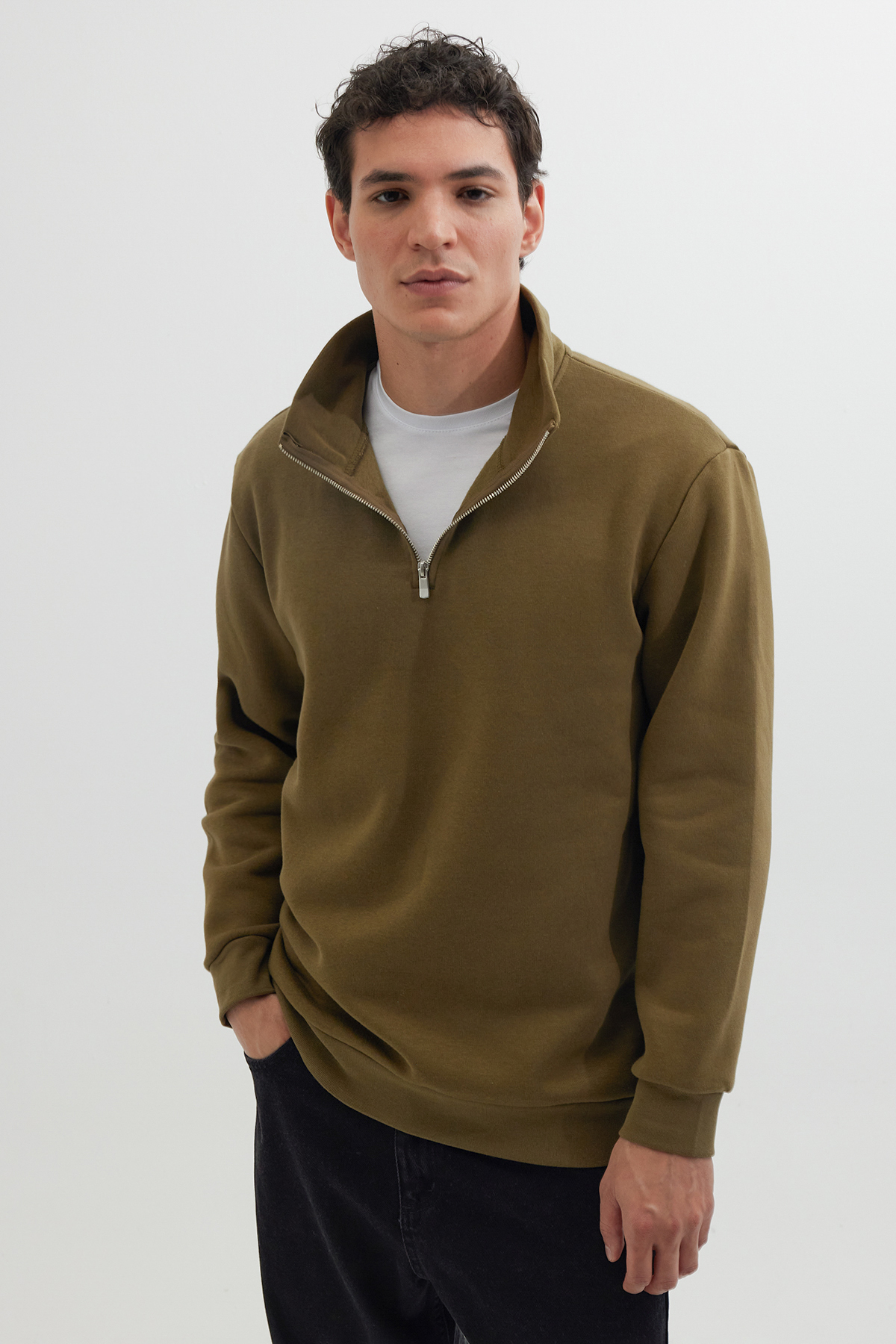 Unisex Relax Fit Rahat Kesim Pamuklu İçi Polarlı Yarım Fermuarlı Yeşil Dik Yaka Sweatshirt