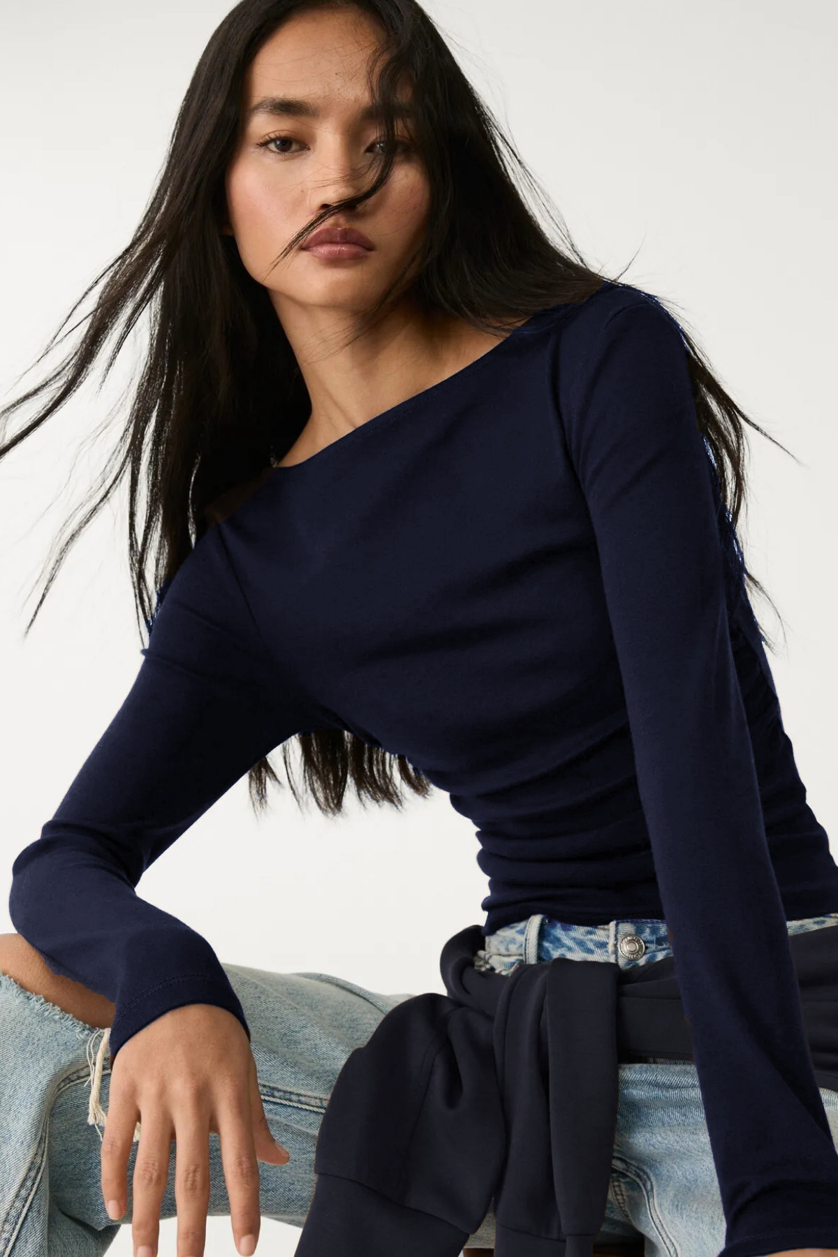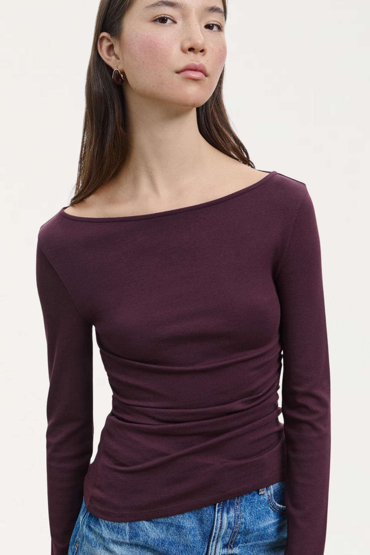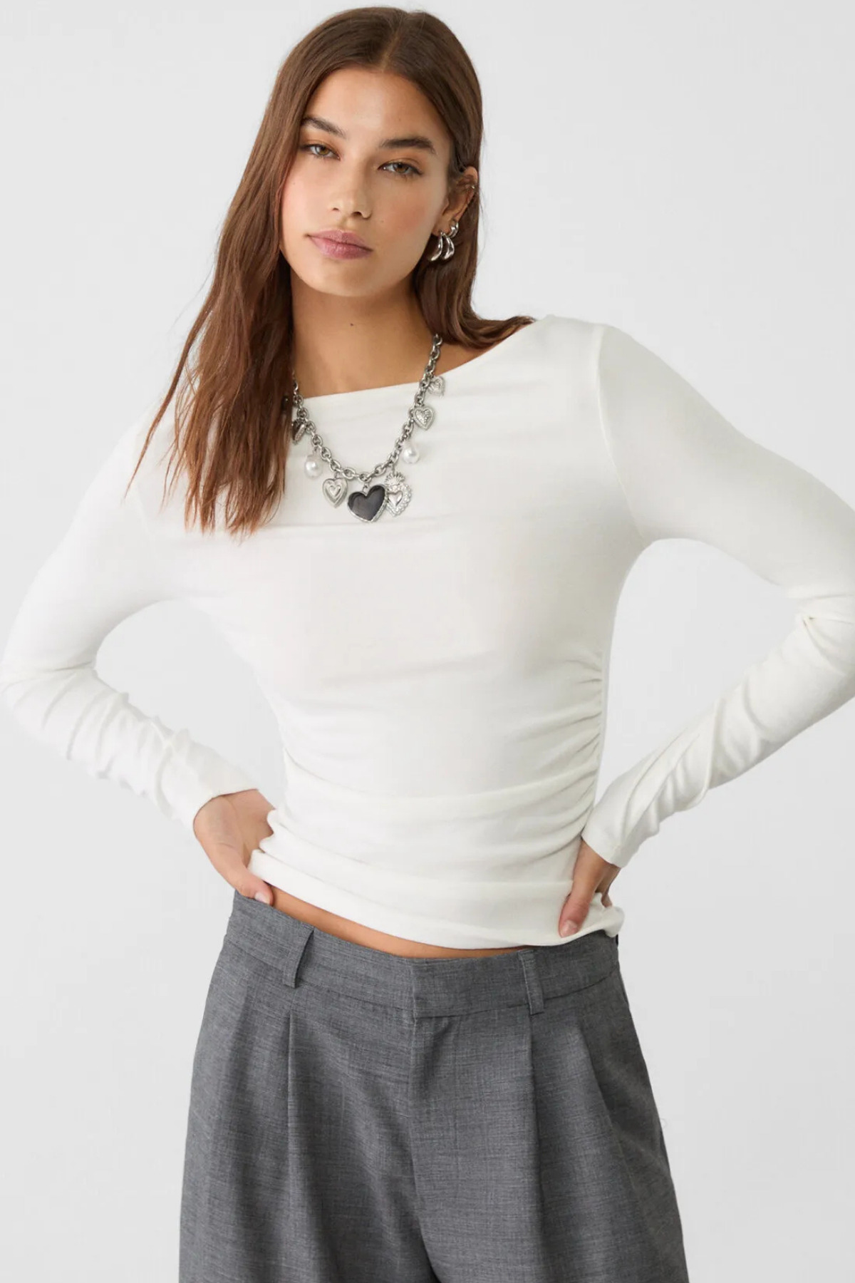 Kayık yaka ve uzun kollu, Yanları Büzgü Detaylı Basic Bluz