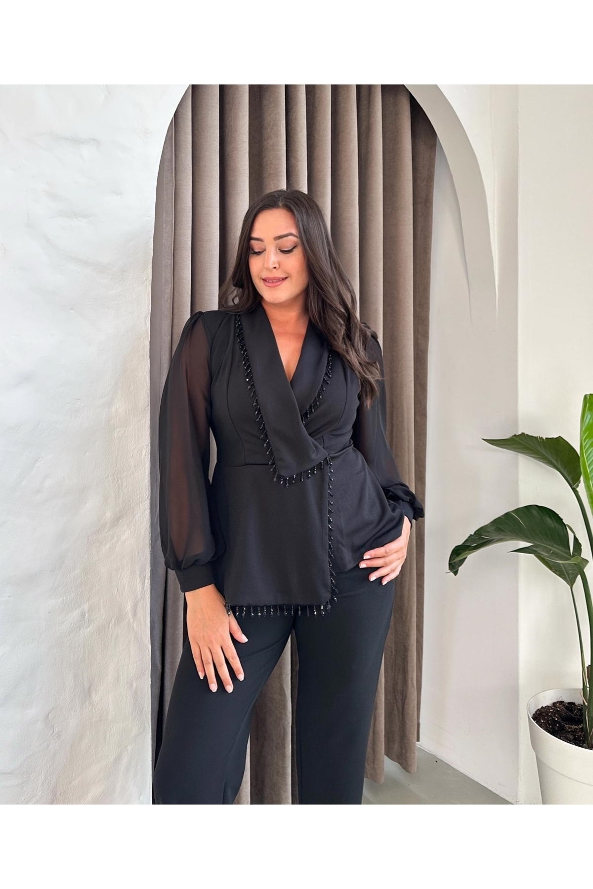 Kadın Büyük Beden Kruvaze Yaka Taş Detaylı Ceket Ön Parçalı Şifon Kol Bluz Pantolon Takımı 24727