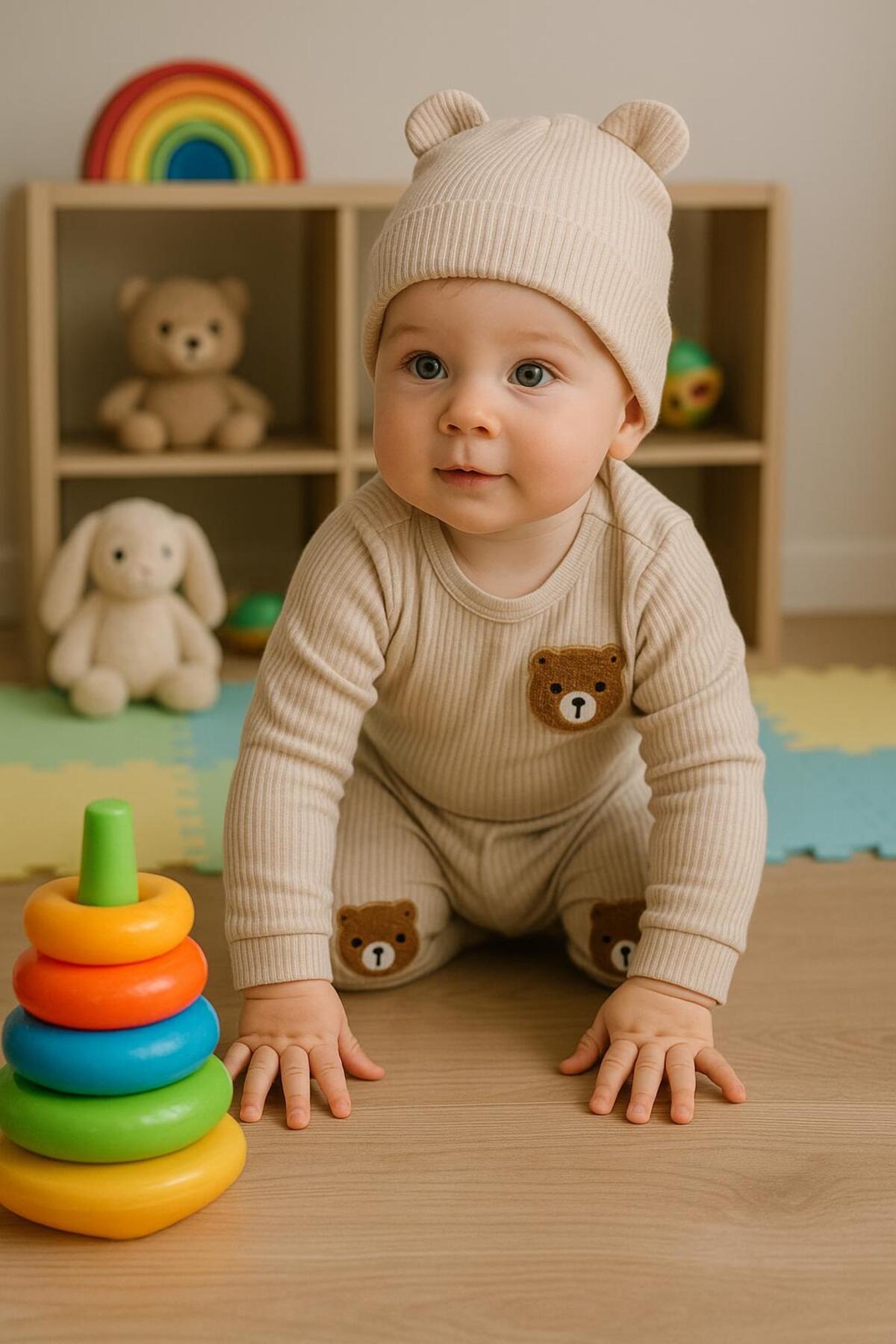 Krem üçlü pamuk kumaş bebek takımı şapka üst zıbın alt zıbın 3 parçadan oluşmaktadır rahat kullanım rahat kumaş