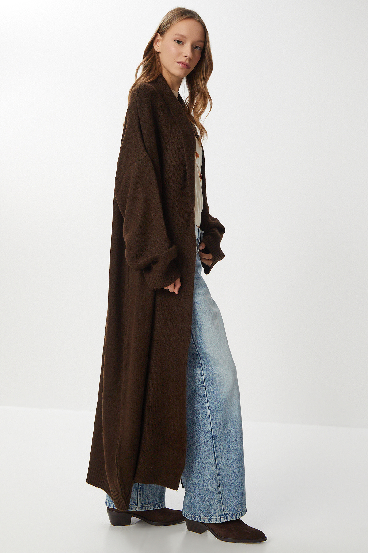 Şal yaka, düşük omuzlu, esnek yapılı, salaş, oversize uzun triko hırkaİçerik: %80 Akrilik %20 PolyesterÜrün Boyu: 140 cm Kol Boyu: 50 cm30° makinede yıkanabilir.