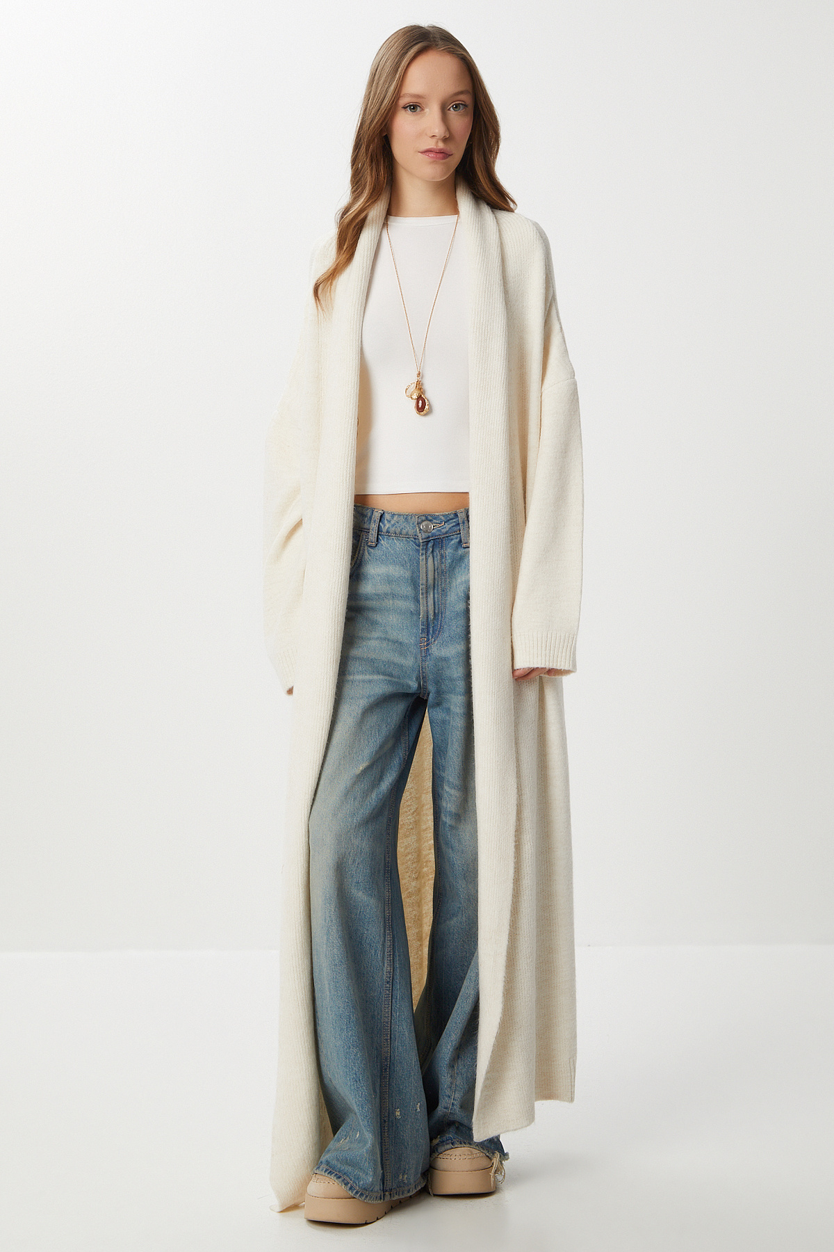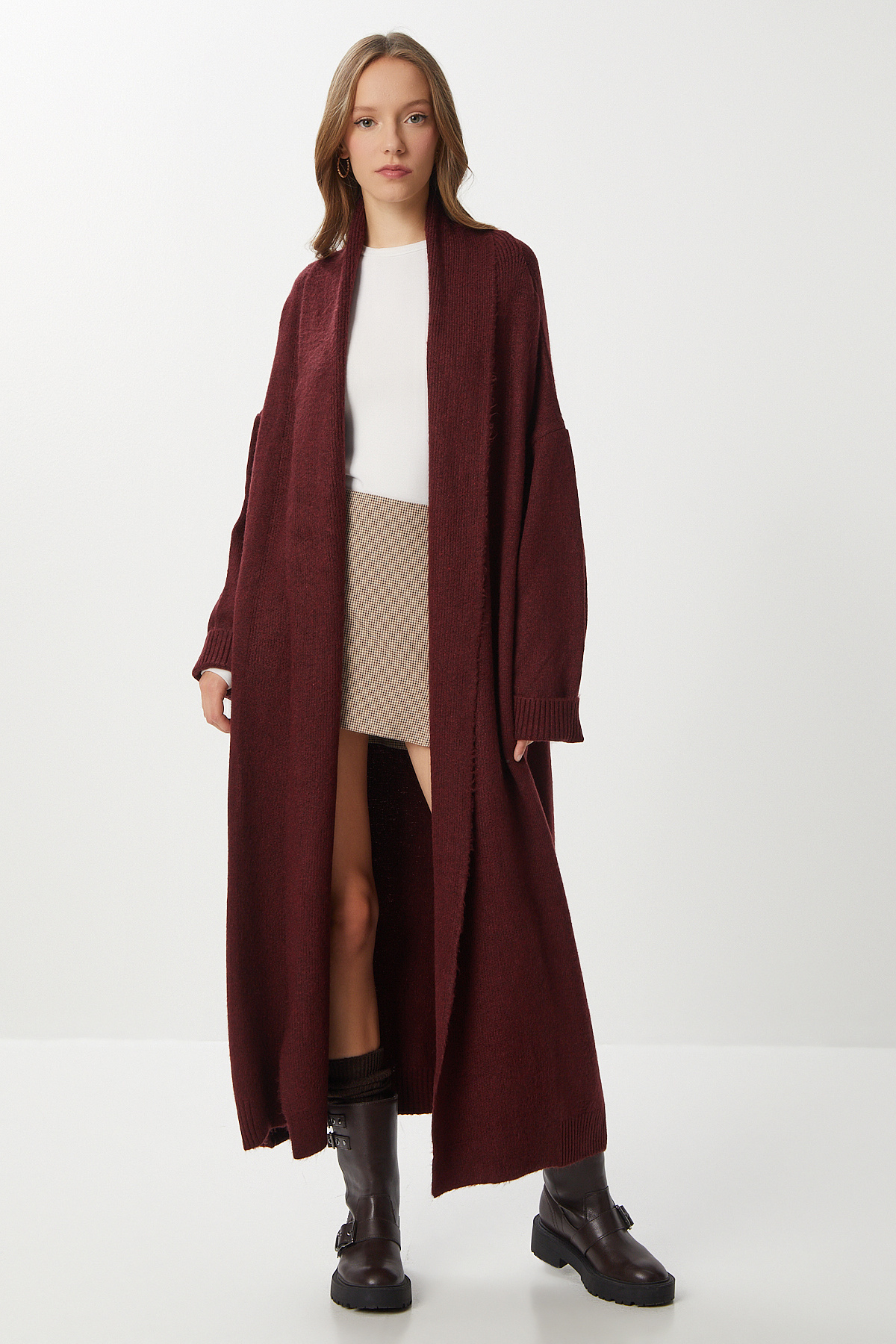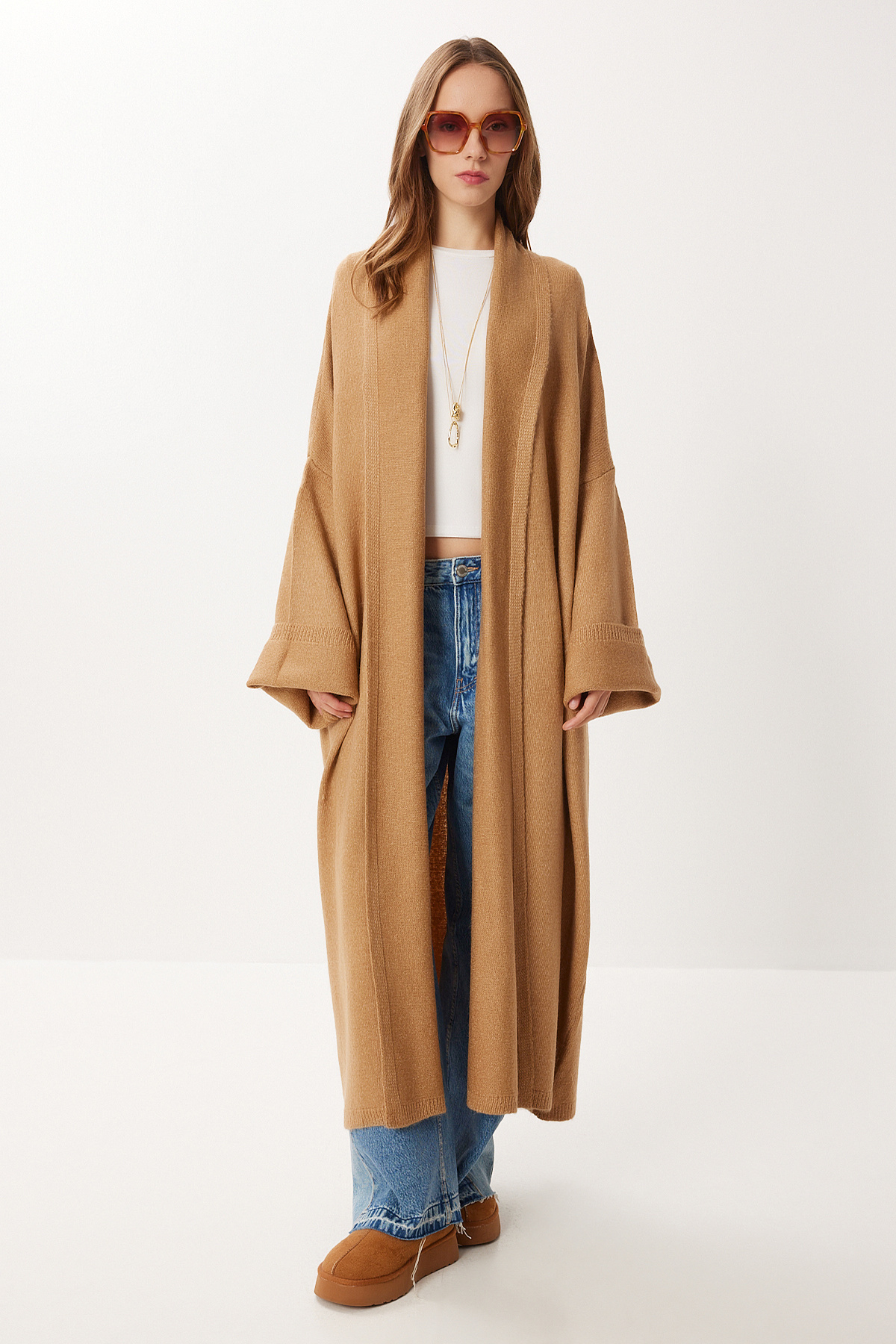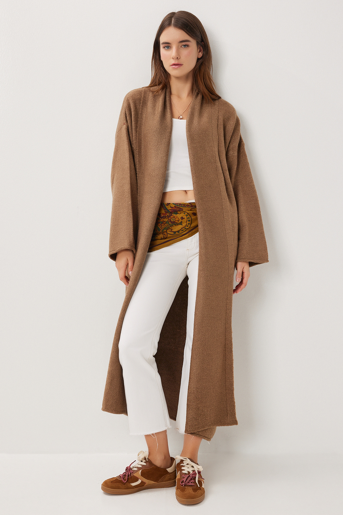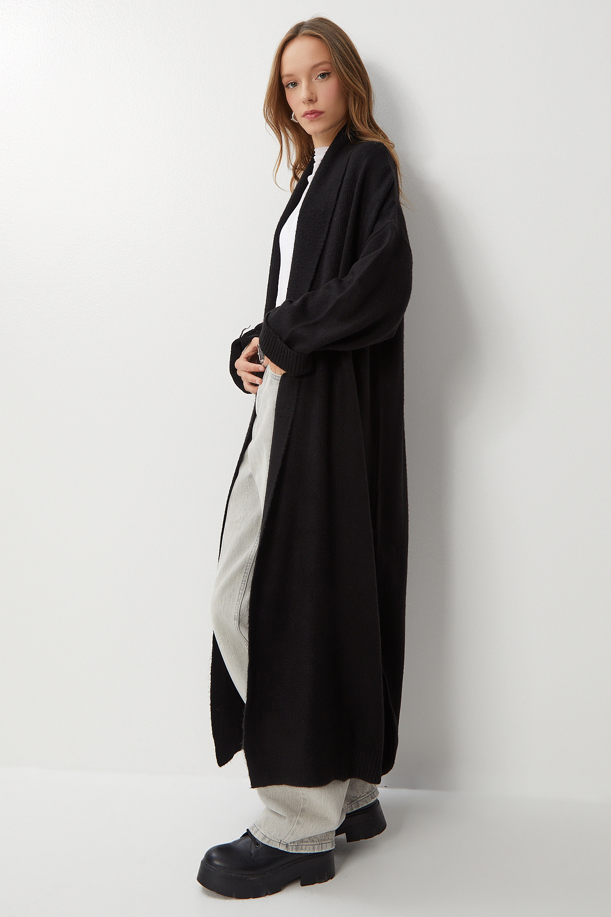 Şal yaka, düşük omuzlu, esnek yapılı, salaş, oversize uzun triko hırkaİçerik: %80 Akrilik %20 PolyesterÜrün Boyu: 120 cm Kol Boyu: 50 cm30° makinede yıkanabilir.