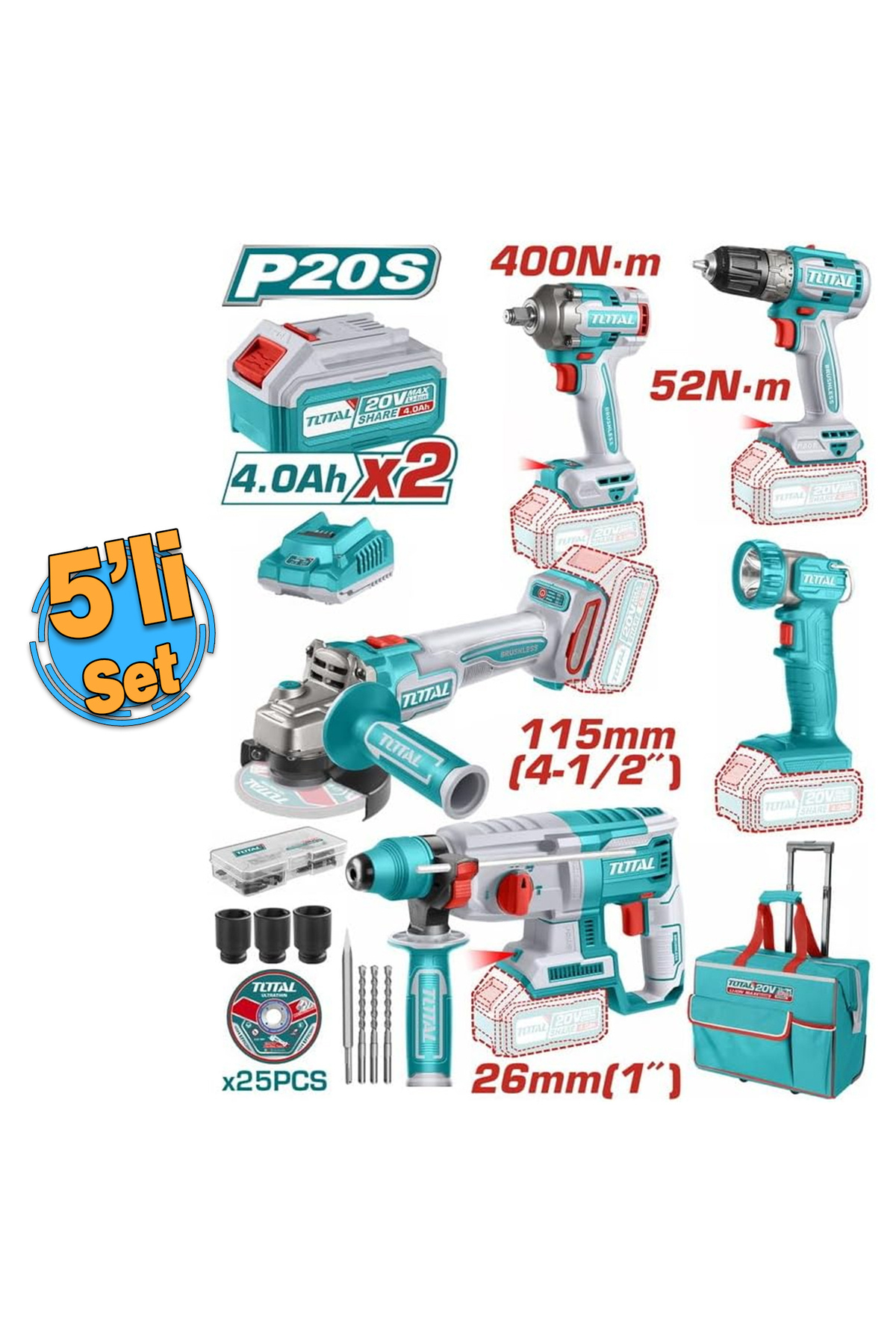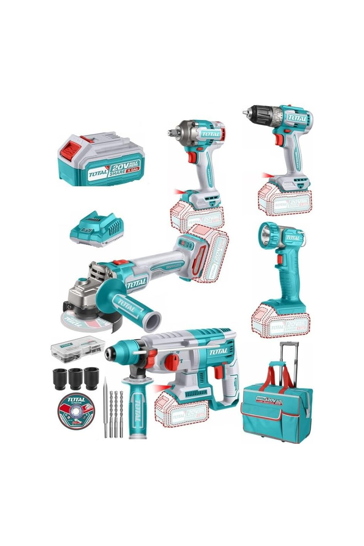 ÖZELLİKLER 1 adet kompakt Fırçasız Akülü Darbeli Matkap (TIDLI206681) 1 adet akülü darbeli anahtar (TIWLI20401) 1 adet akülü kırıcı-delici (TRHLI20268) 1 adet akülü açılı taşlama makinesi (TAGLI27153) 1 adet çalışma lambası (TWLI2038) TIWLI20401: Kömürsüz motor Kare tahrik: 1/2"""" Boşta çalışma hızı: 0-1600/0-1900/0-2300 dev/dak Darbe hızı: 0-2100/0-2500/0-2900 bpm Sıkıştırma torku: 400 Nm Somun sıkma torku: 550 Nm TIDLI206681: Kömürsüz motor Boşta çalışma hızı: 0-500/0-2000 dev/dak Maksimum darbe hızı: 30000 bpm Maksimum tork: 66 Nm Metal mandren Mandren kapasitesi: 13 mm Tork ayarları: 22+1+1 Mekanik 2 vitesli şanzıman Mil kilidi fonksiyonu Entegre LED çalışma lambası TRHLI20268: Kömürsüz motor Boşta çalışma hızı: 0-1100 dev/dak Darbe hızı: 0-5000 bpm Darbe enerjisi: 2,5 J Maksimum delme kapasitesi: betonda 26 mm çap Entegre LED çalışma lambası SDS plus mandren sistemi TAGLI27153: Kömürsüz motor Maksimum giriş gücü: 1000 W Yüksüz Hız: 3000/6000/9000 dev/dak Disk çapı: 115 mm Mil dişi: M14 TWLI2038: LED güç dağılımı: 5 W Lümen: 270 ± %10 İçerik: 3 Adet soket (17, 19, 21 mm) 3 Adet matkap 1 Adet keski 1 Set 115 mm aşındırıcı metal kesme diski (25 Adet) 47 Adet aksesuar 2 Adet 4.0 Ah pil takımı (TFBLI2002) 1 Adet şarj cihazı (TFCLI2001E) Şarj voltajı: 220-240 V ~ 50/60 Hz Kanvas çanta içinde paketlenmiştir