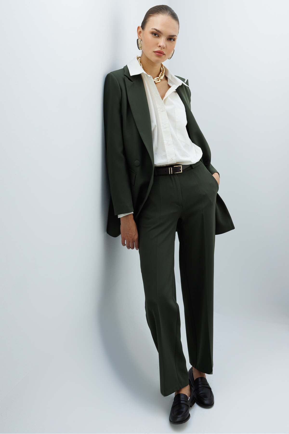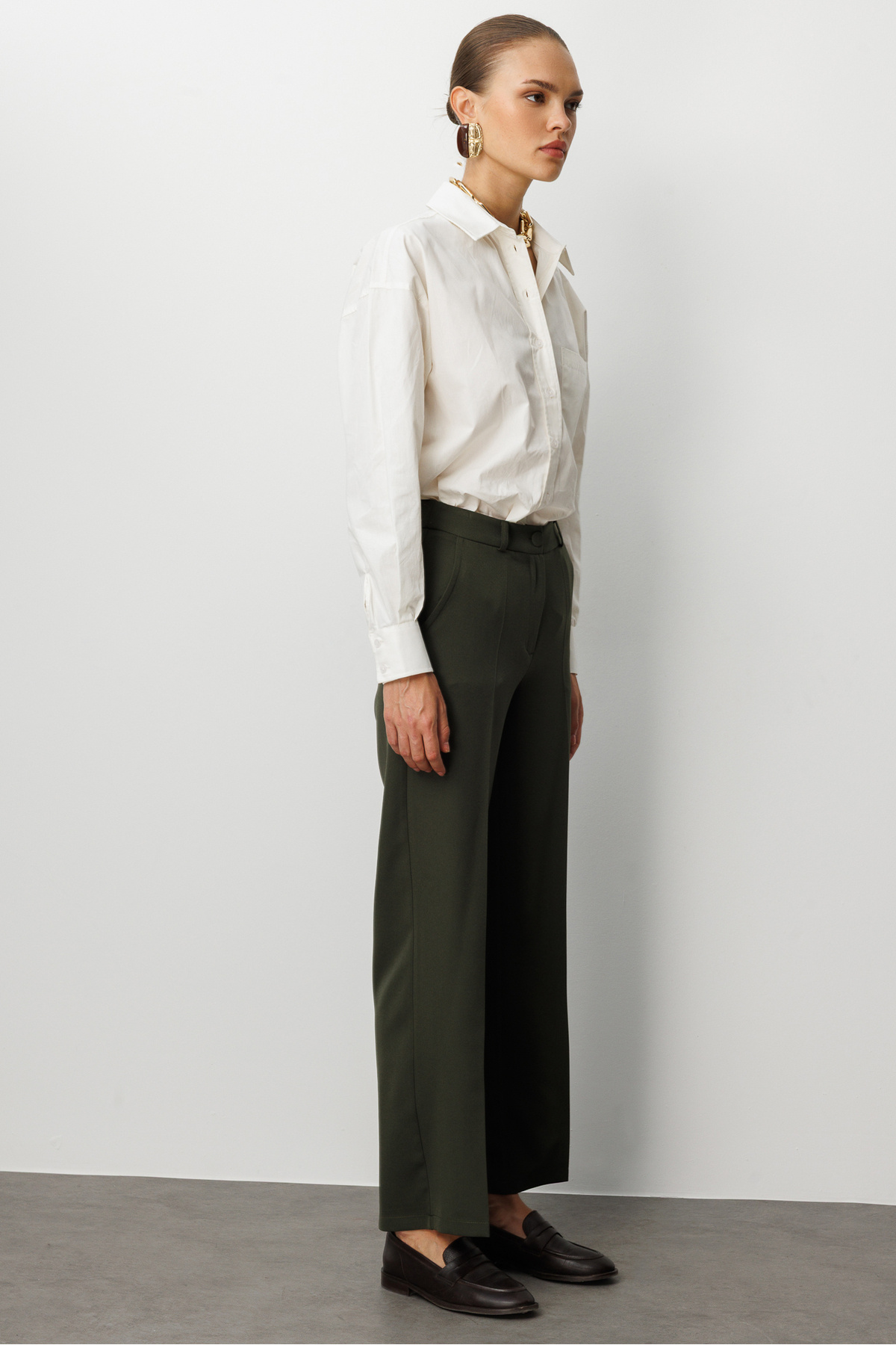 - Klasik ve zamansız bir stil sunan haki renkli kumaş pantolon, her gardırobun temel parçası.