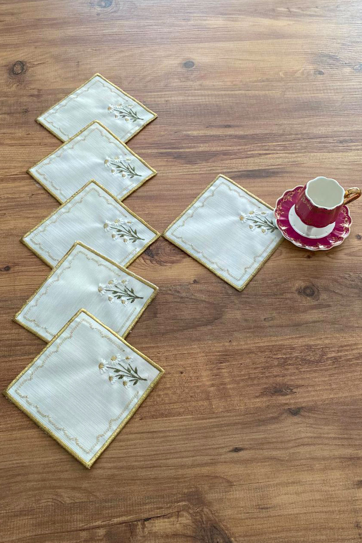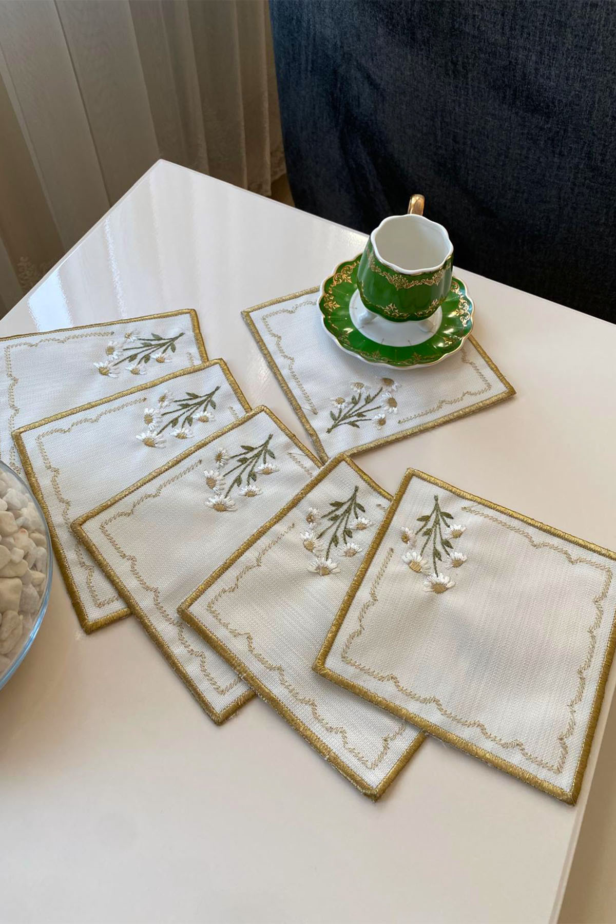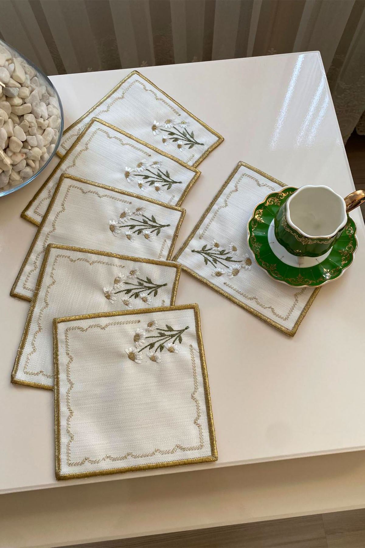 Malzeme: Keten kumaş Paket İçeriği: 6 Adet Ölçüler: 15x15cm Renk: Gold Kullanım Alanı: Kahve sunumluk, Çay sunumluk, Çerez sunumluk, Masa dekoru.