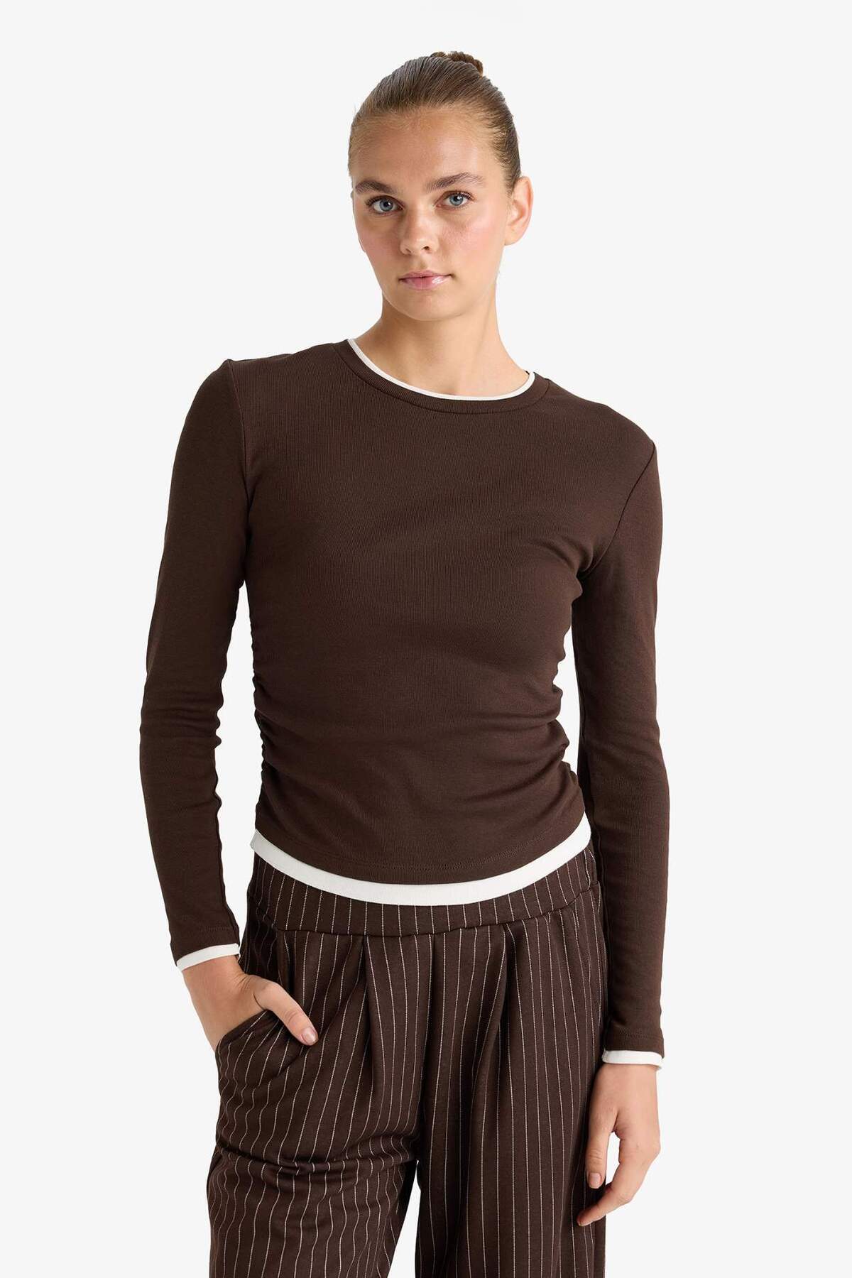 Slim fit dar kesimi ve bisiklet yaka tasarımıyla modern bir görünüm sunan ribana uzun kollu tişört, esnek ve nefes alabilen kumaşıyla gün boyu konfor sağlar.