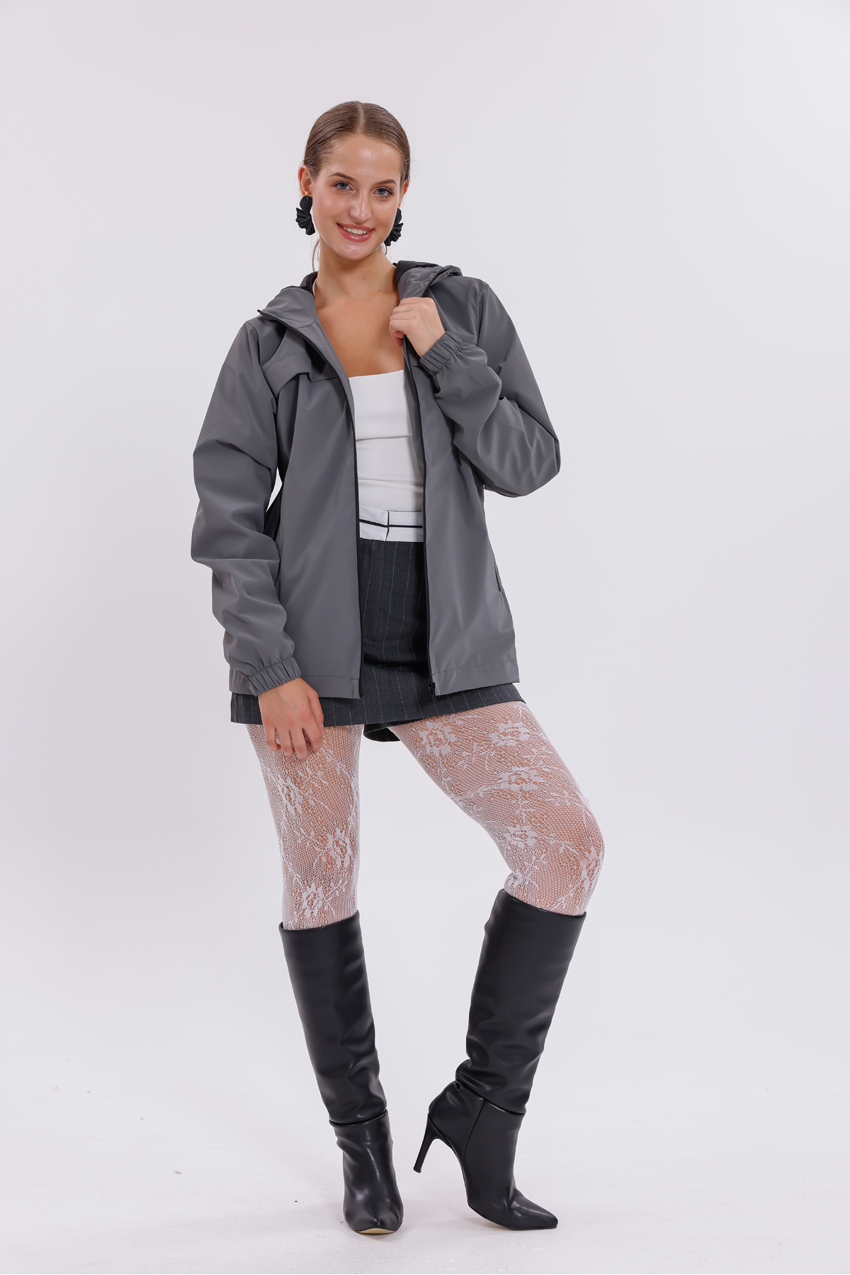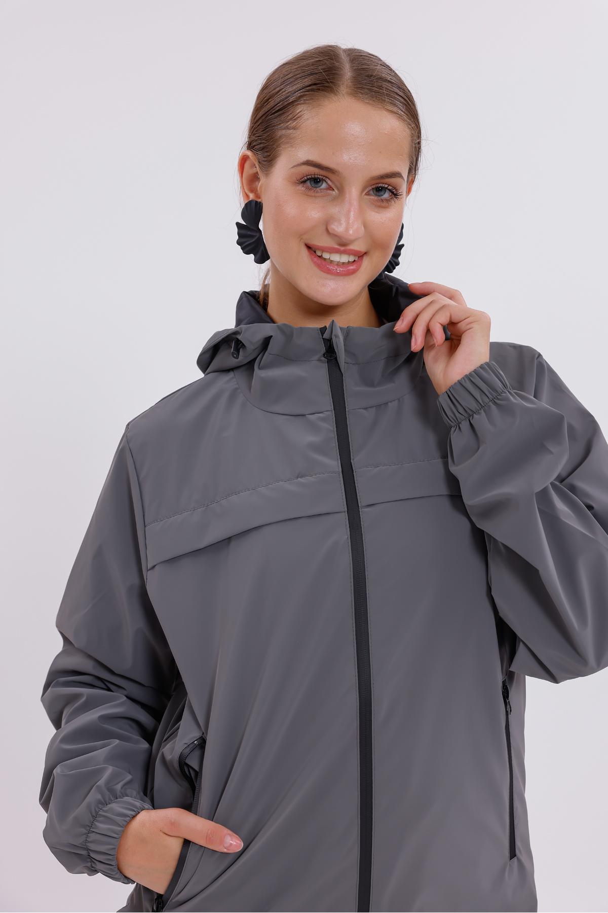 Kadın Antrasit Kapüşonlu Nova Kumaş Şık Mevsimlik Su ve Rüzgar Geçirmez Yağmurluk