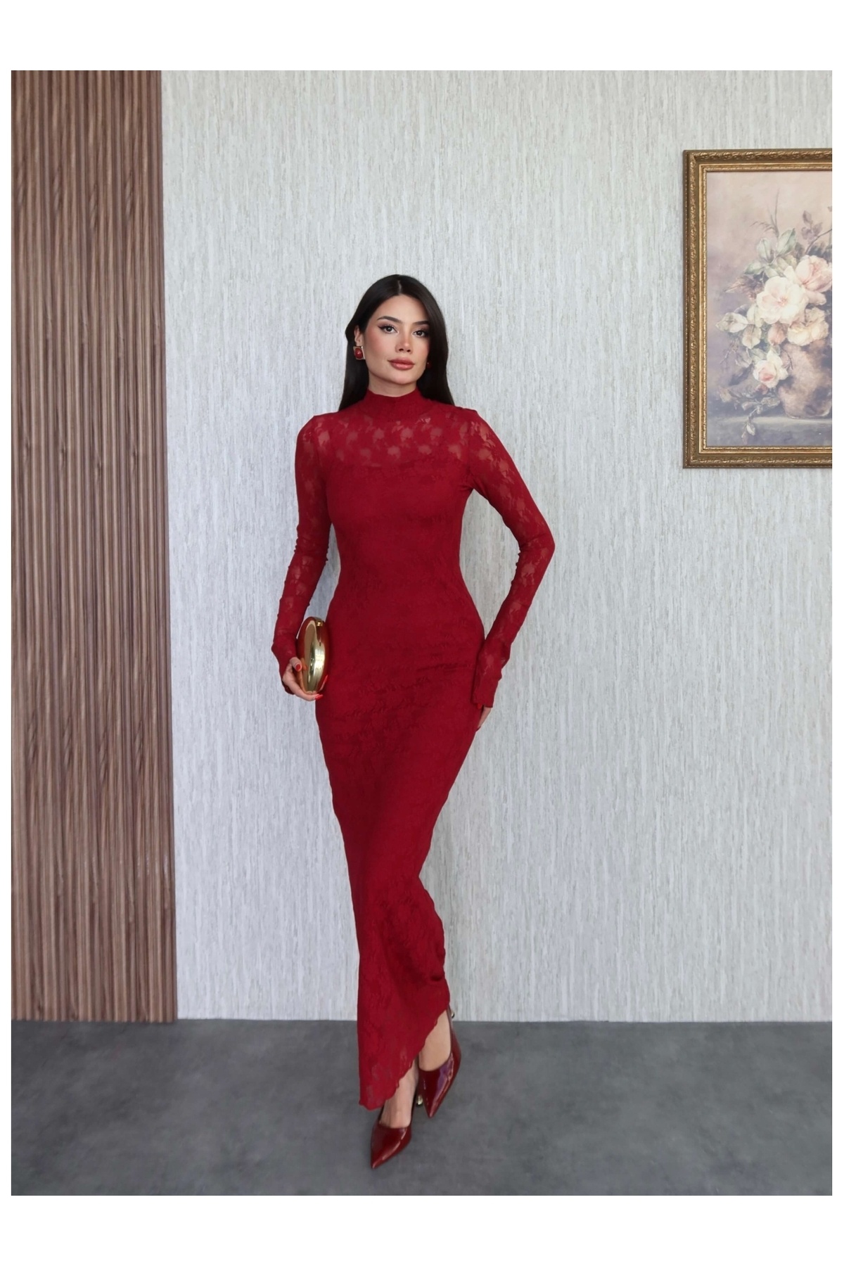 Astarlı Dantel Detay Dik Yaka Elbise