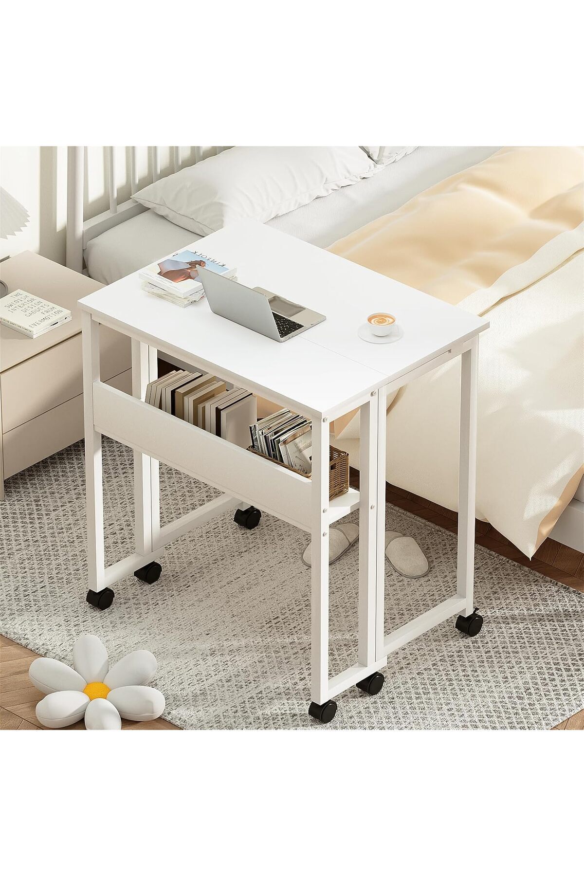 Depolama Raflı Katlanır Masa, 63 cm Tekerli Bilgisayar Masası, Kolay Montaj, Küçük Alanlar İçin