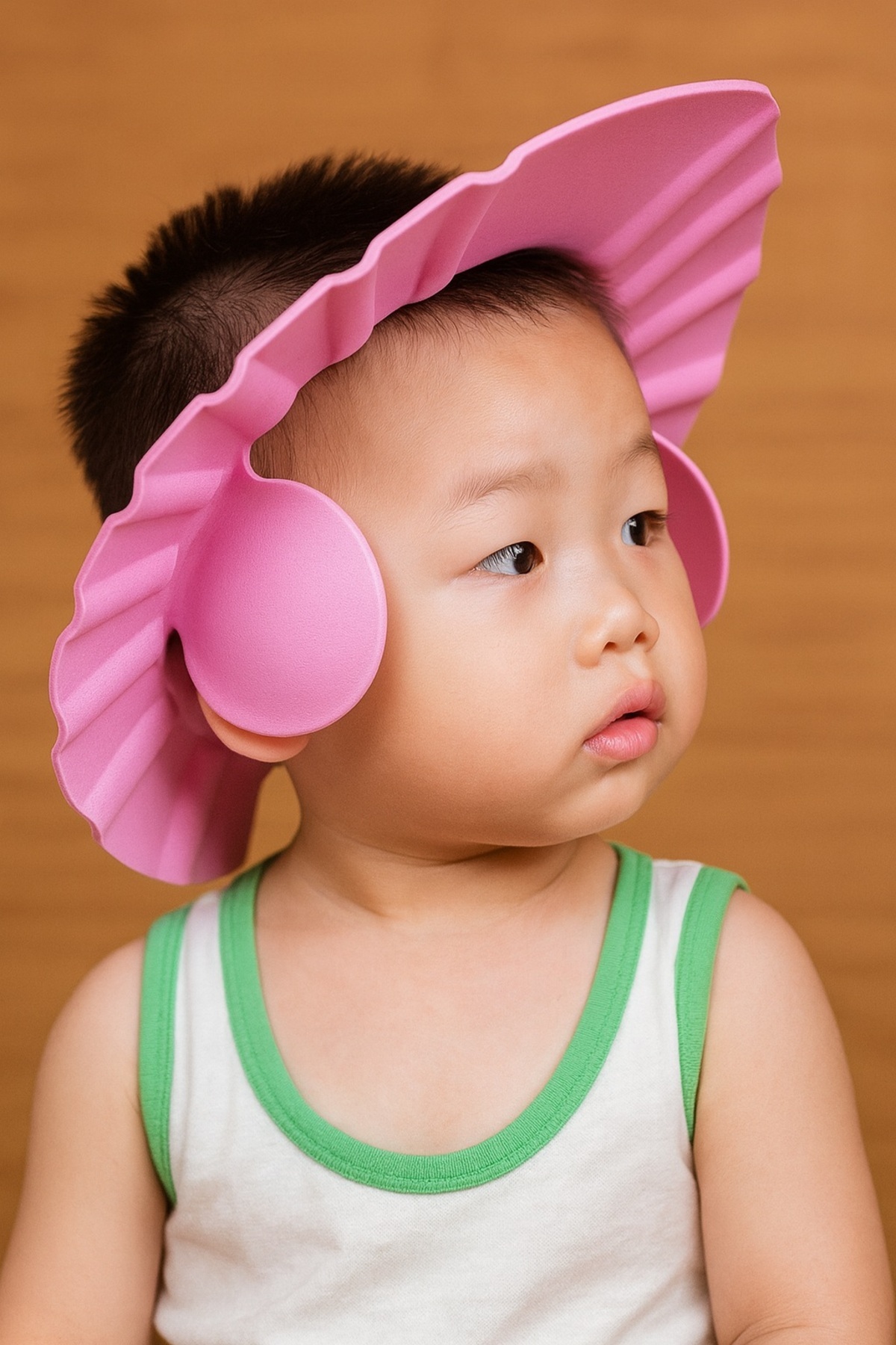 Kulaklıklı Düğmeli Ayarlanabilir Gözleri Korumak Saç Yıkama Bebek Banyo Şapkası Pembe