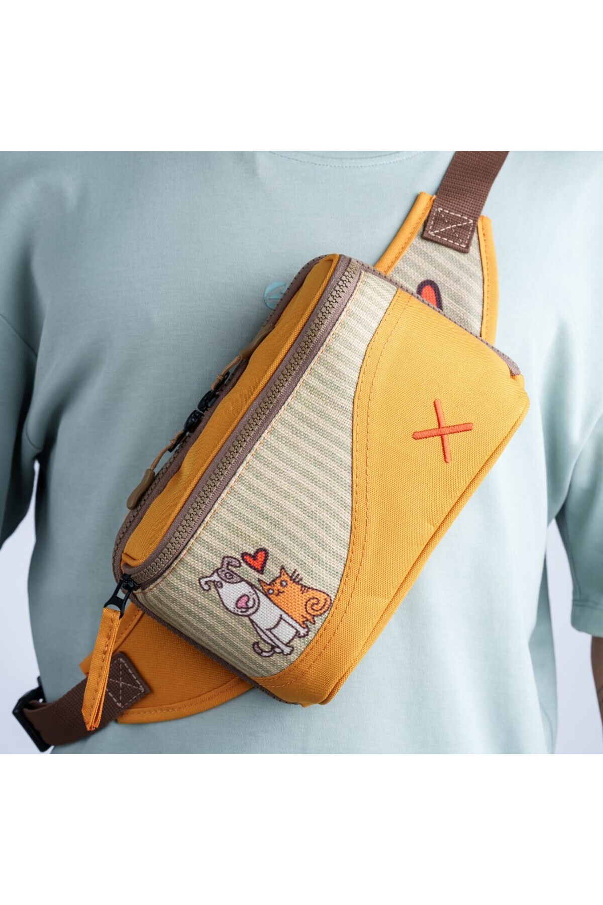 Sarı Renkli Kedi & Köpek Desenli Kanvas Unisex Göğüs ve Bel Çantası