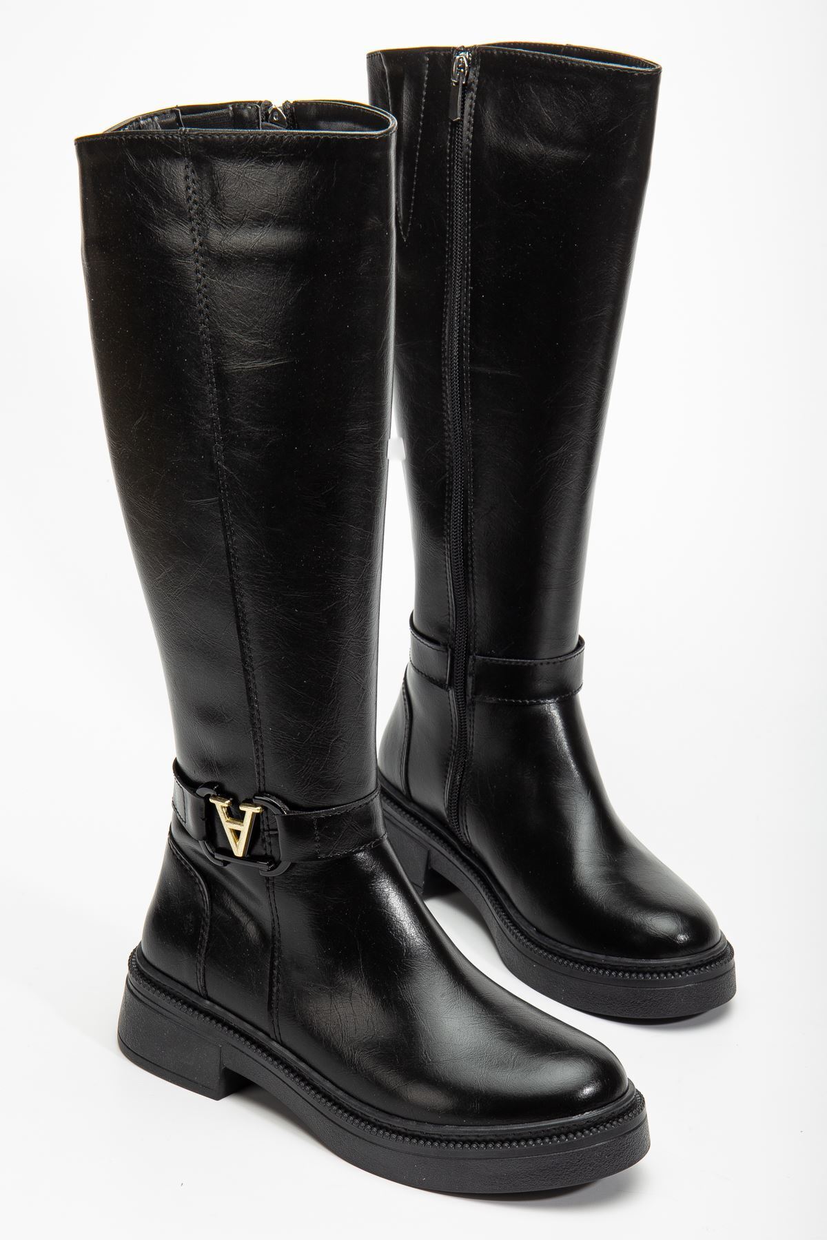 Kadın Siyah Cilt Streç Toka Detaylı Çizme
