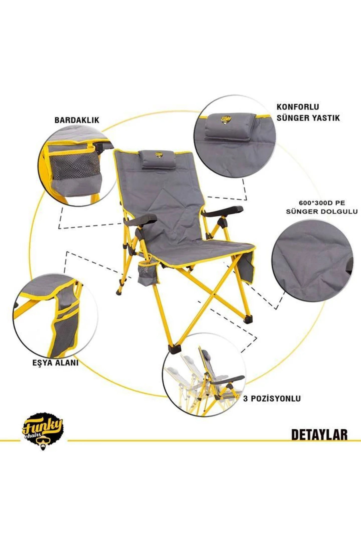 Doğada ev konforunu yaşamak isteyenlere özel olarak tasarlanan FUNKY CHAIRS Comfort 3 Kademeli Katlanabilir Kamp Sandalyesi, sarı rengiyle kamp alanınıza canlılık katıyor! 225 kg taşıma kapasitesi ve güçlendirilmiş çelik iskeleti sayesinde üstün dayanıklılık sunar.
