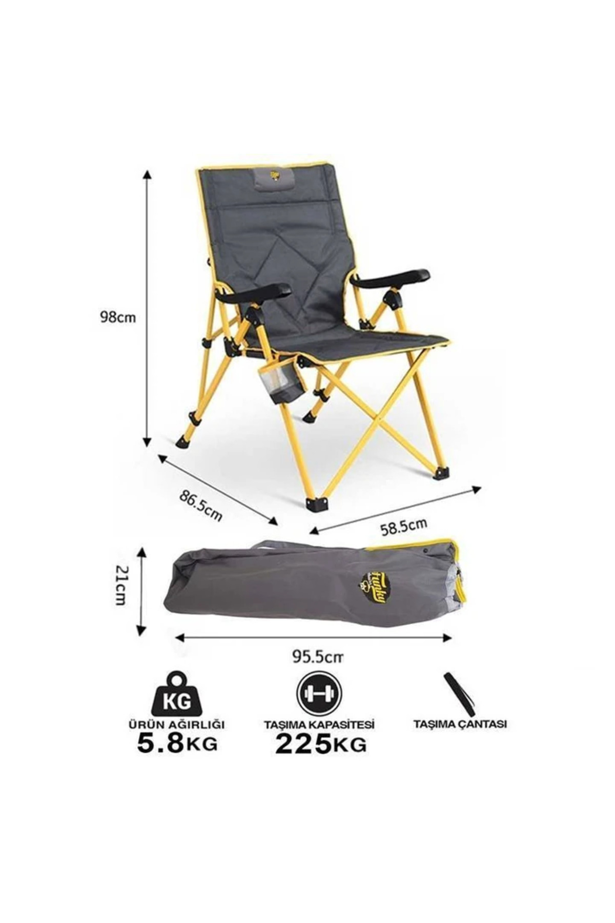 Güneşe ve hafif yağmura dayanıklı kumaşıyla dört mevsim kullanıma uygun olan bu sandalye, pratik bardaklık ve iki bölmeli file ceplik gibi detaylarla konforunuzu artırır.