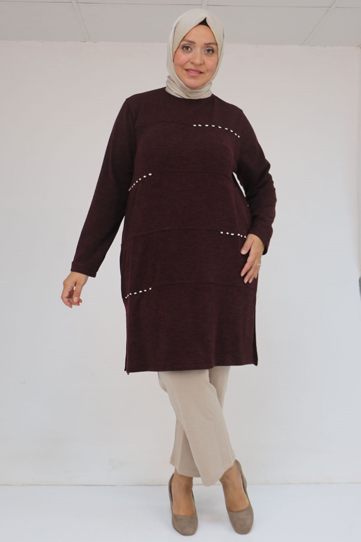 58113 Büyük Beden Dikme Taş Detaylı Çımalı Mir Tunik - Mürdüm