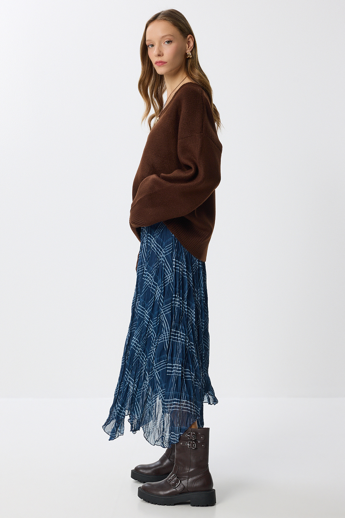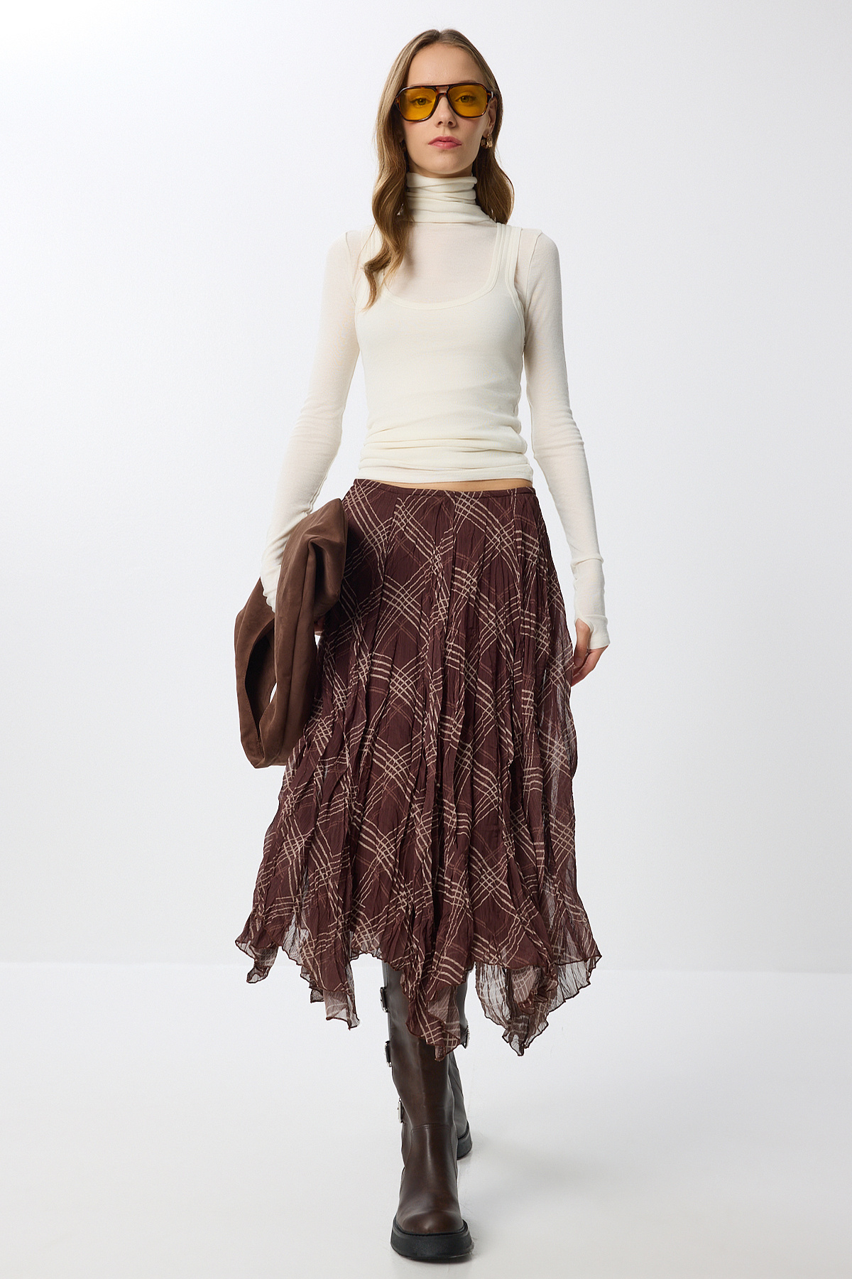 Desenli Kırışık Efektli Midi Şifon Etek LNS0082 MÜRDÜM