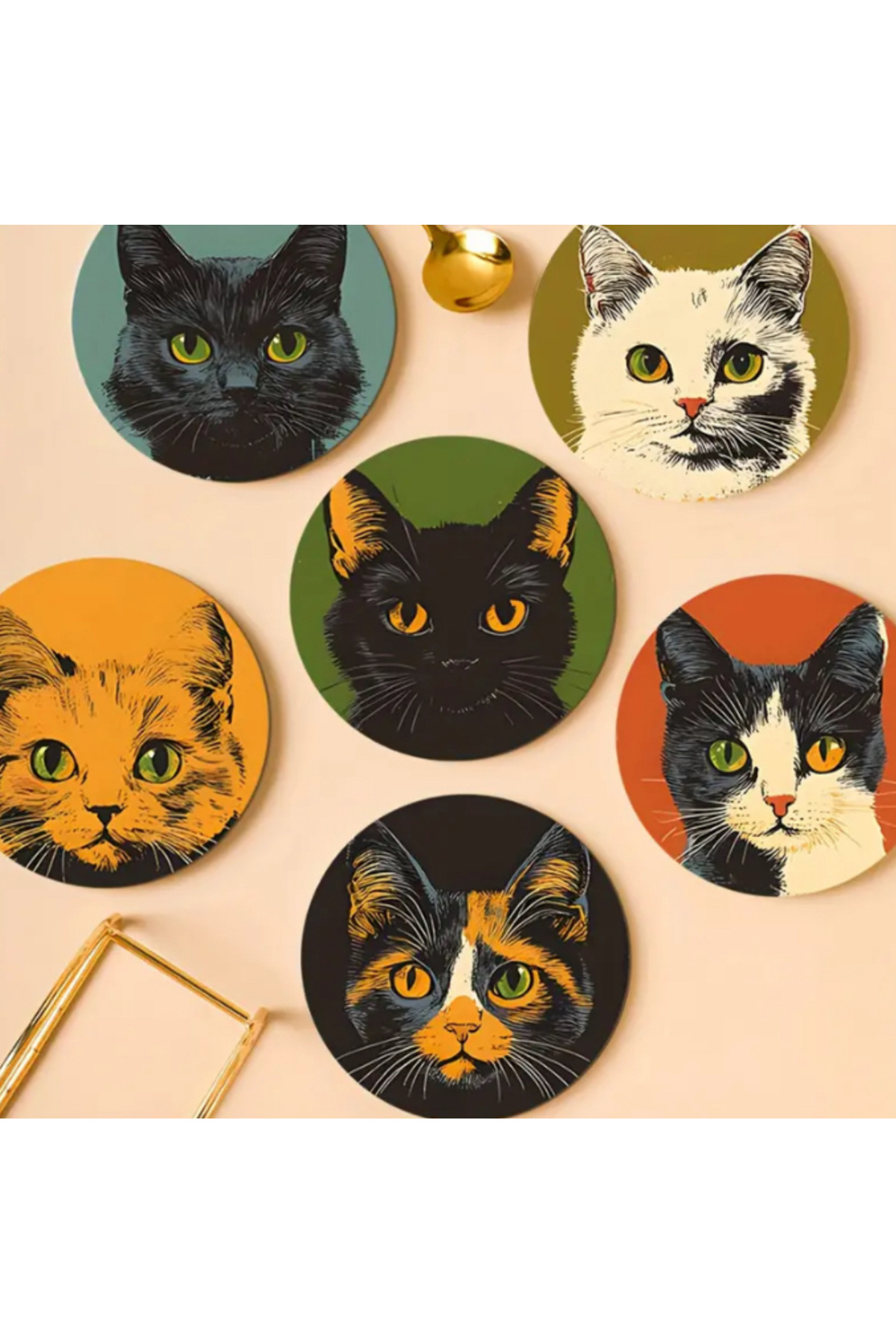 🎨 Tasarım Özellikleri:• 6 farklı renk ve kedi illüstrasyonu (yeşil, turuncu, kahverengi, gri, zeytin ve teal tonları)• Yuvarlak formda, kaliteli baskı ve dayanıklı malzeme• Sıcak ve soğuk içecekler için uygun• Ev, ofis veya hediye alternatifi olarak ideal