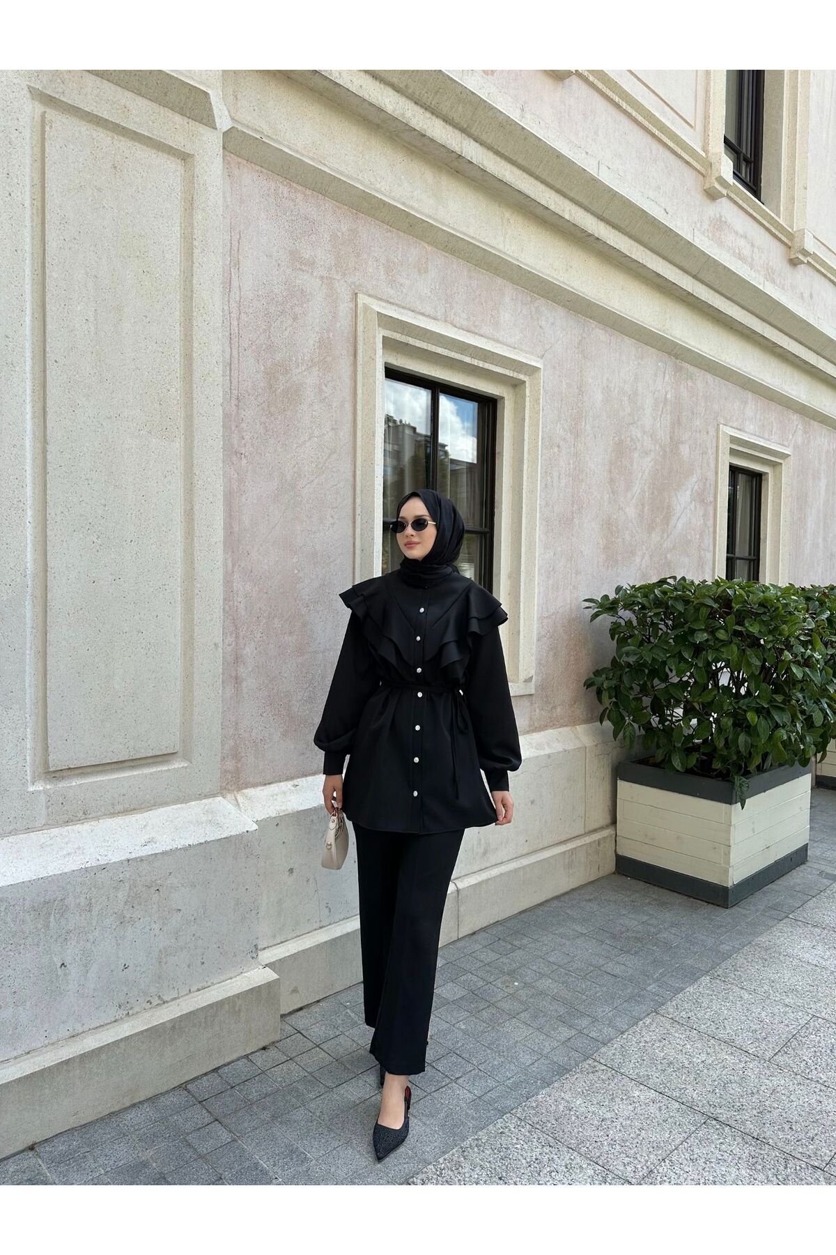 Lacivert siyah beyaz krem • Krep kumaştan üretilmiştir (dökümlü ve rahat kullanımlı) • Üst boyu: 82 cm • Pantolon boyu: 95 cm • Düğmeli, volanlı ve yakası kapalı tasarım • Rahat kalıp, günlük ve özel davetlerde şıklık sağlar 🌸 Kumaşı sayesinde dört mevsim rahatlıkla kullanılabilir.