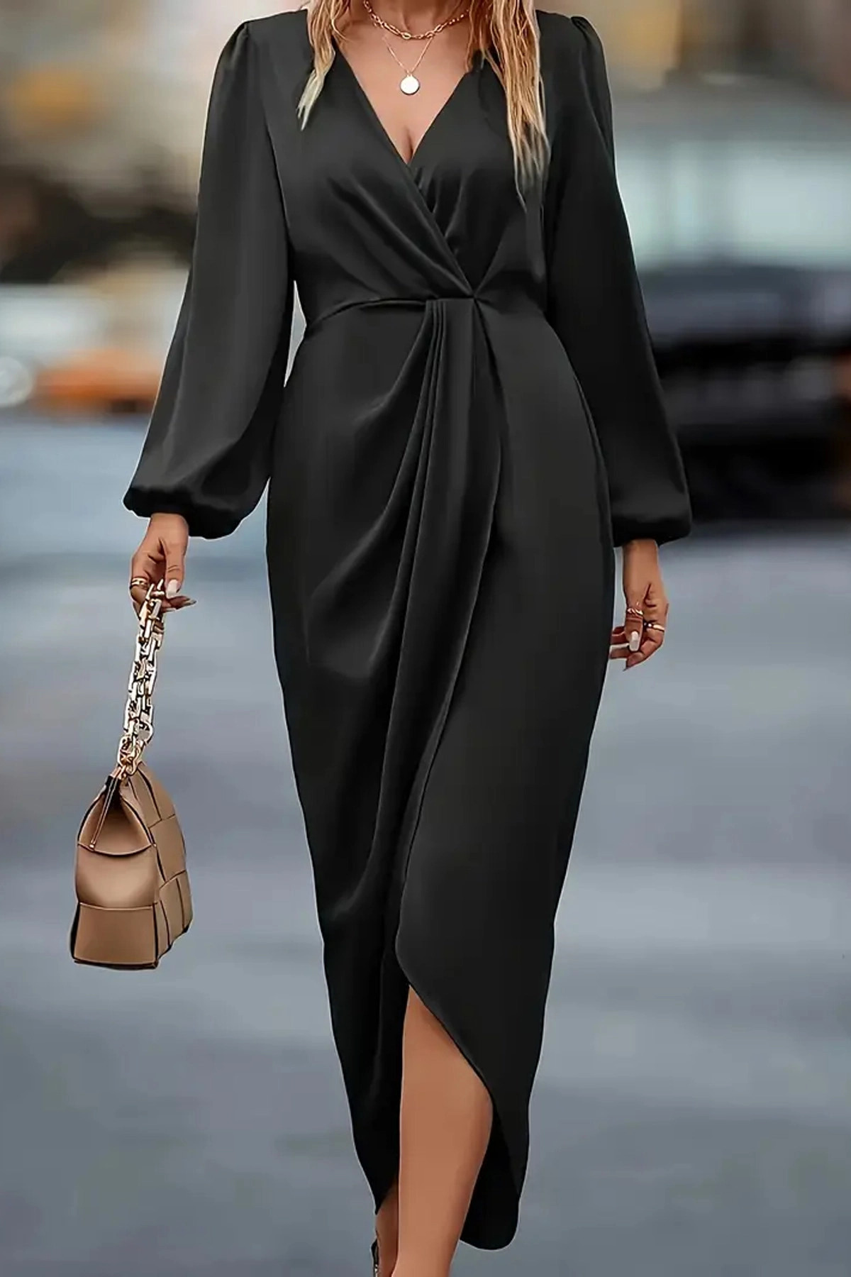 Kadın Zümrüt Yeşili Kruvaze Yaka Kol ve Bel Lastik Büzgülü Drapeli Saten Abiye Elbise