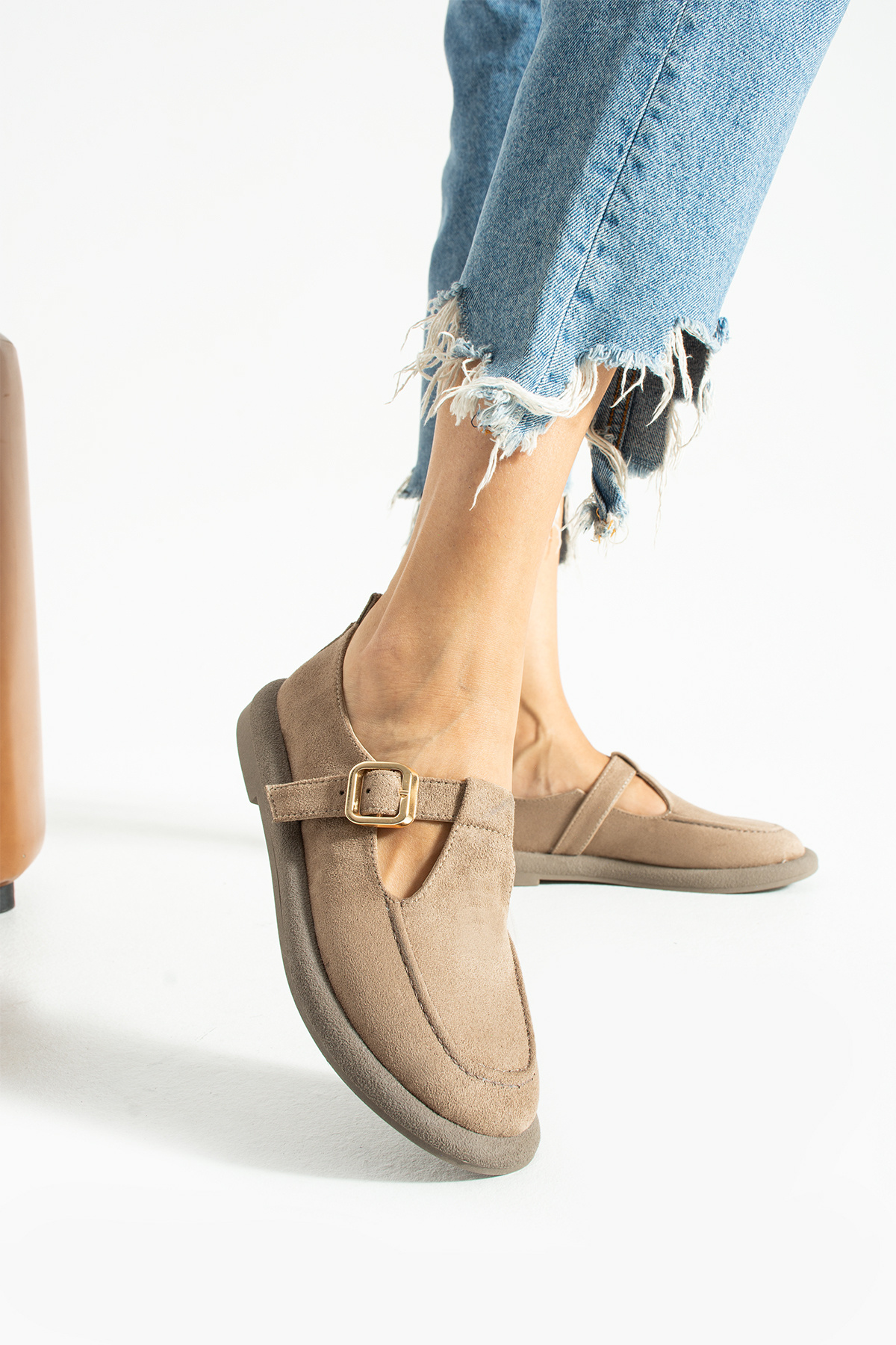 ün boyu konfor ve şıklığı bir arada yaşamak isteyenler için tasarlandı! Bu taba süet T-Bar tokalı loafer ayakkabı, hem modern hem de zamansız tarzı ile dolabınızın vazgeçilmezi olacak.