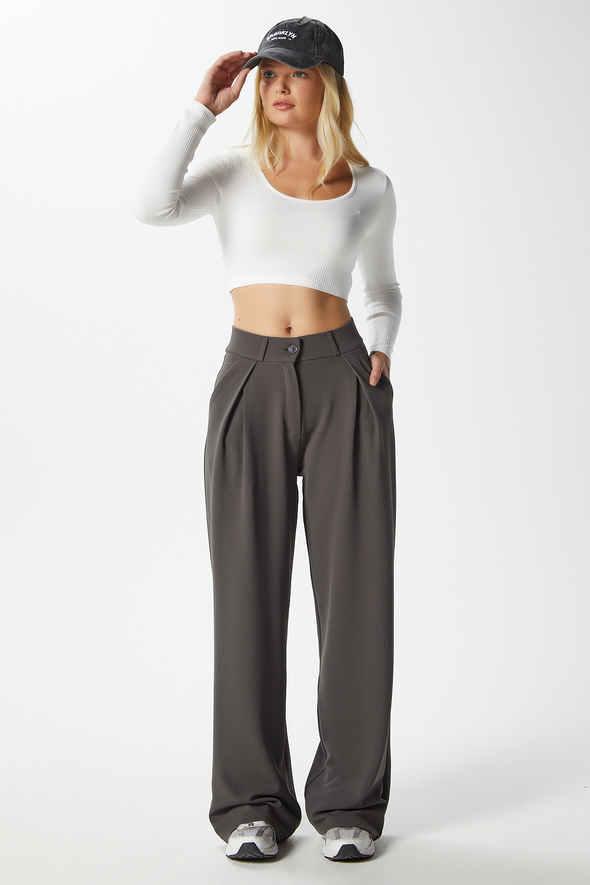 Likra Serisi Viora Açık Pile Esnek Antrasit Palazzo Pantolon - Son resimde tüm bedenlerin bel boy iç bacak basen ölçüleri mevcuttur.