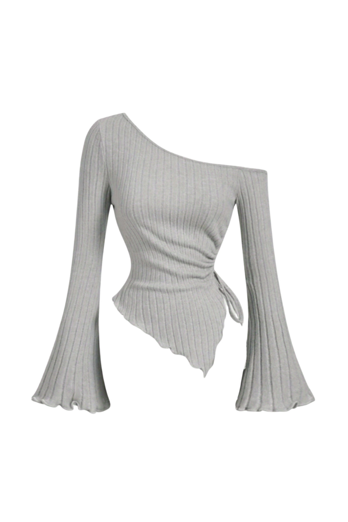 Gri Fitilli Asimetrik Tek Omuz Spanyol Kol Bluz & Yüksek Bel Bol Paça Pantolon Takım