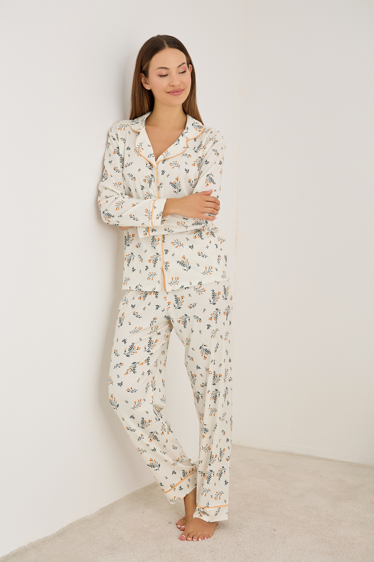 ekru yaprak desenli Bürümcük-Krınkıl Uzun Kollu Düğmeli Biyeli Pijama Takım 7931