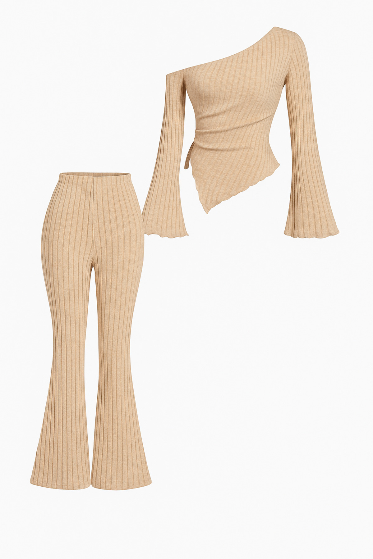 Bej Fitilli Asimetrik Tek Omuz Spanyol Kol Bluz & Yüksek Bel Bol Paça Pantolon Takım