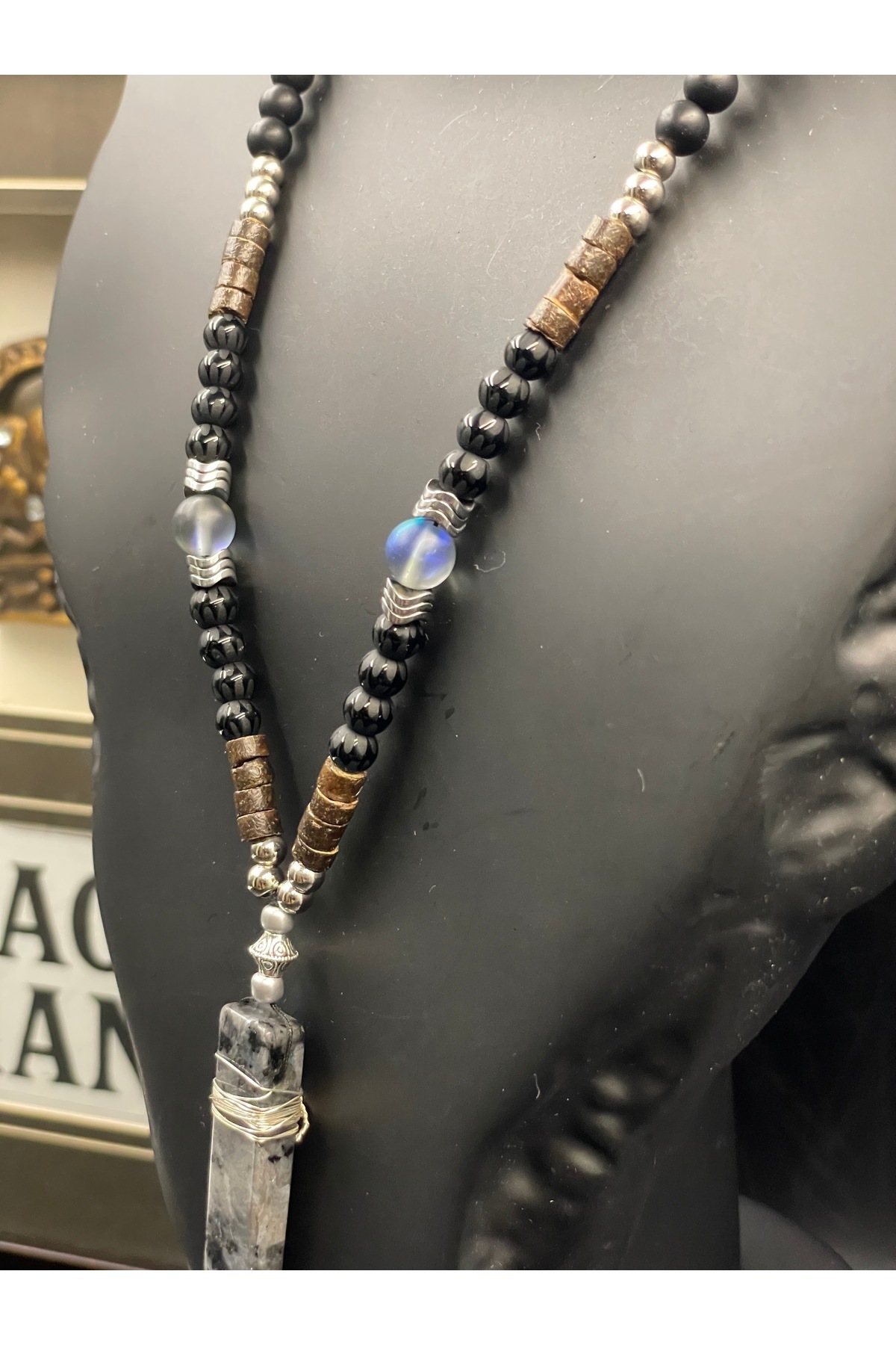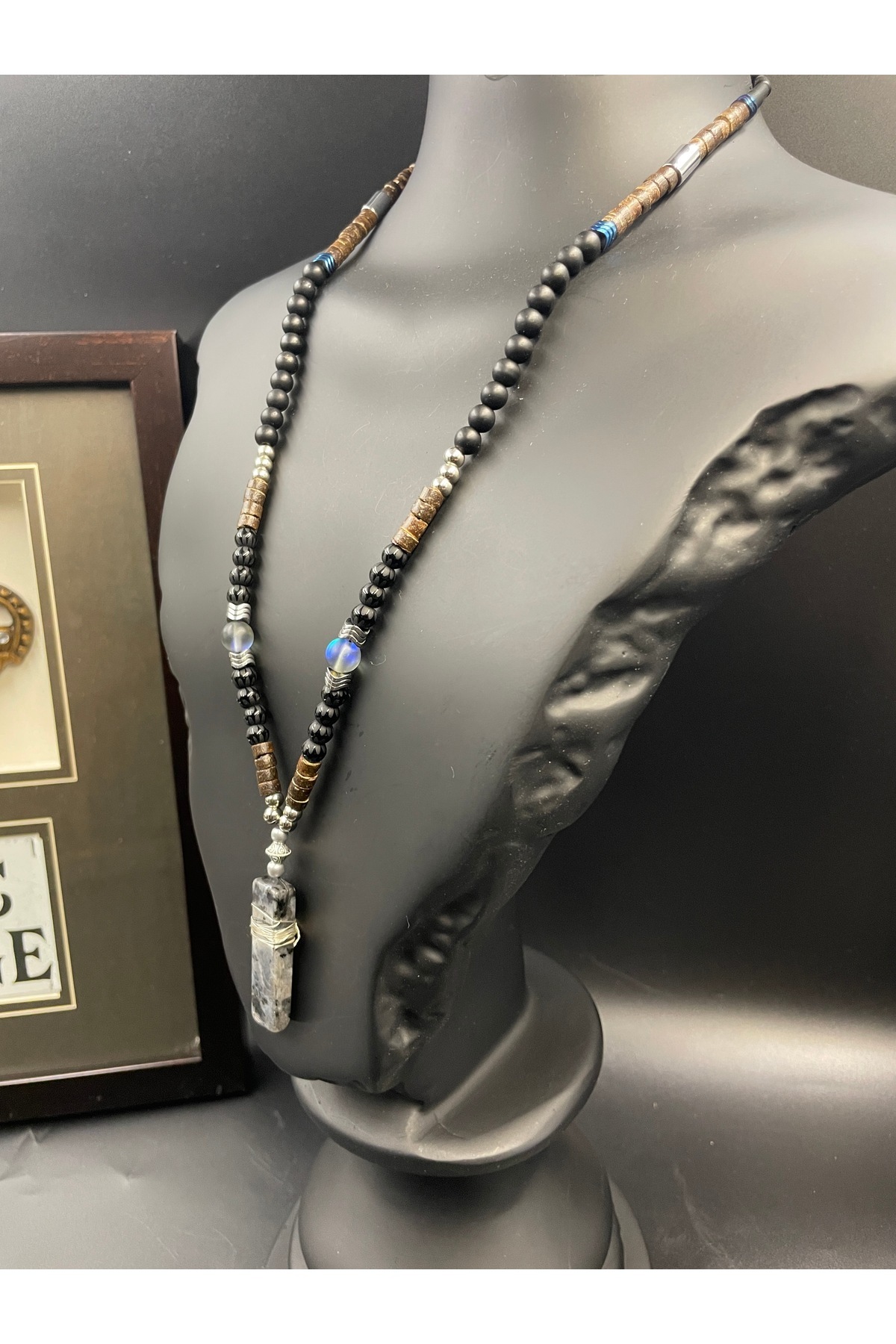 Doğal taşların gücünü taşıyan özel tasarım Magicgrange kolye…Lavrakist uç, Batman oniks, hematit ve thermal doğaltaşın enerjisini pirinç detaylarla birleştirdik.