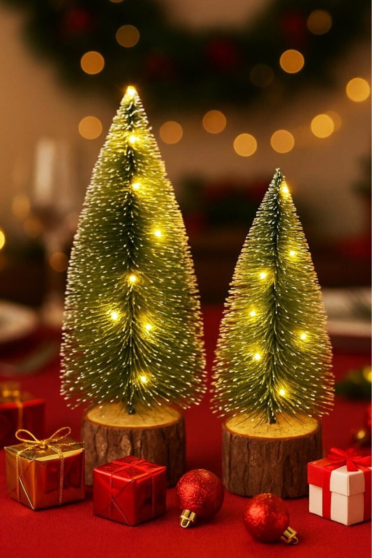 2 farklı boyda tasarlanan (19 cm ve 22 cm) bu mini çamlar, doğal görünümlü ahşap tabanları ve LED ışıklarıyla dikkat çeker.