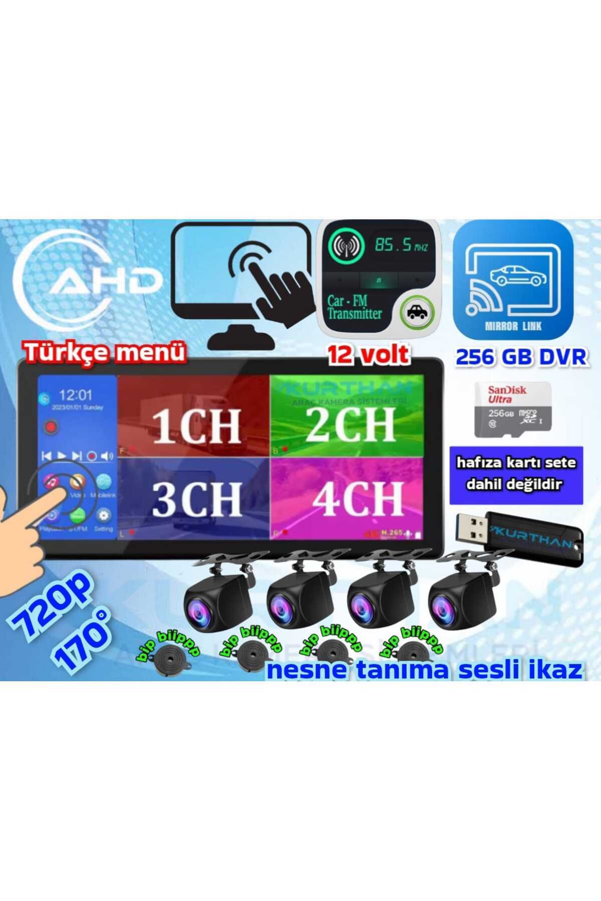 4 ADET AHD 720P NESNE TANIMALI SESLİ İKAZLI KAMERA DVR DOKUNMATİK MONİTÖR 12 VOLT