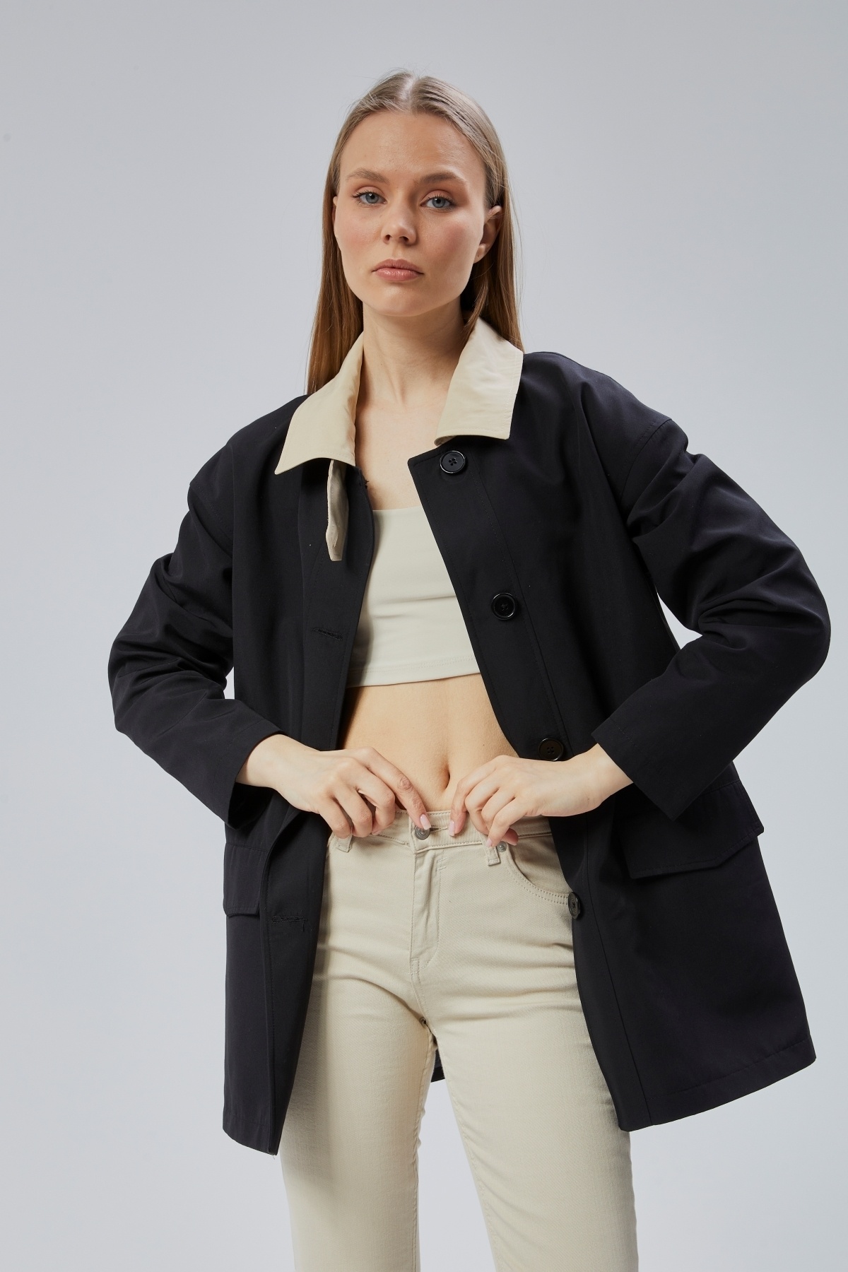 • Siyah Oversize Casual Midi Trençkot
