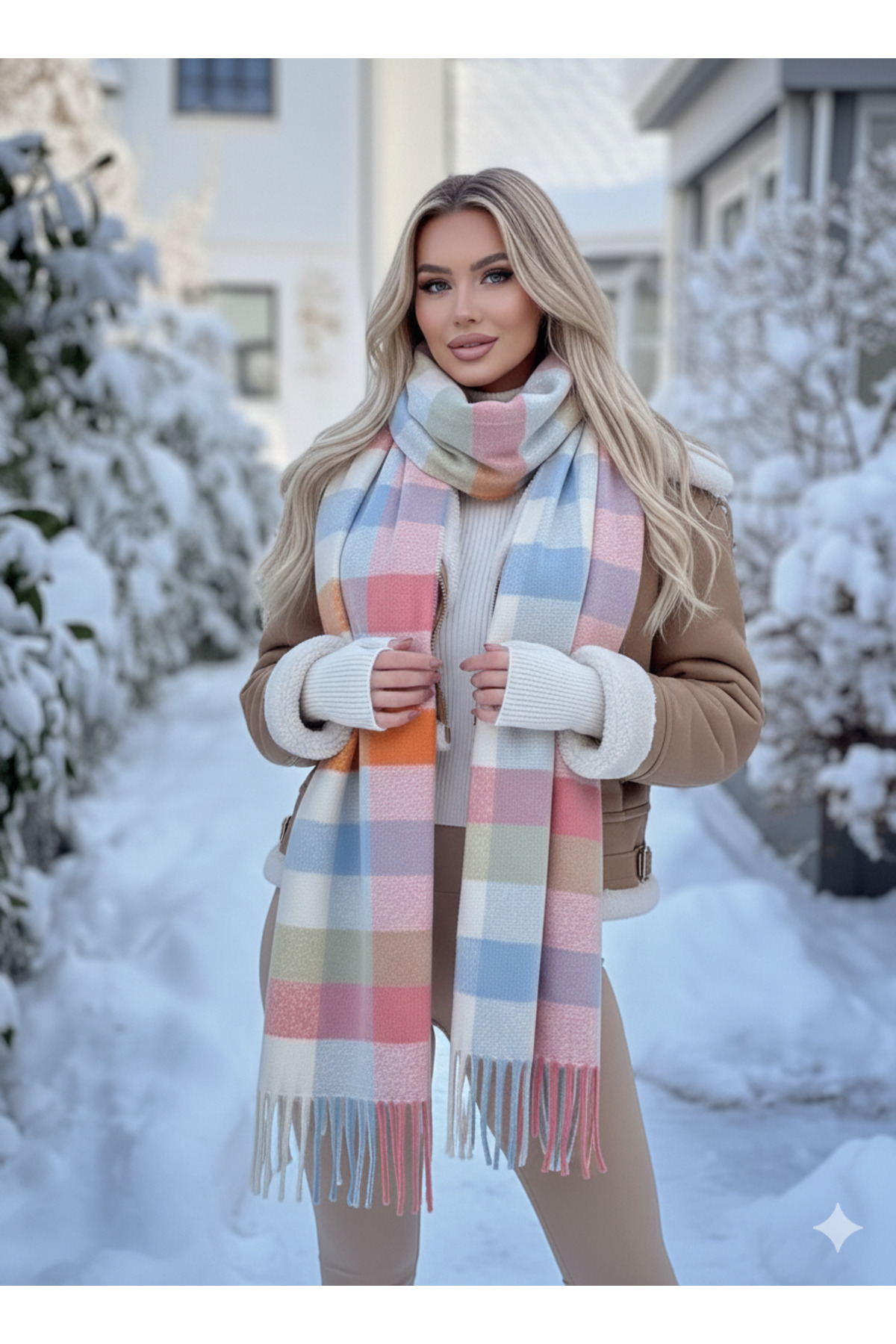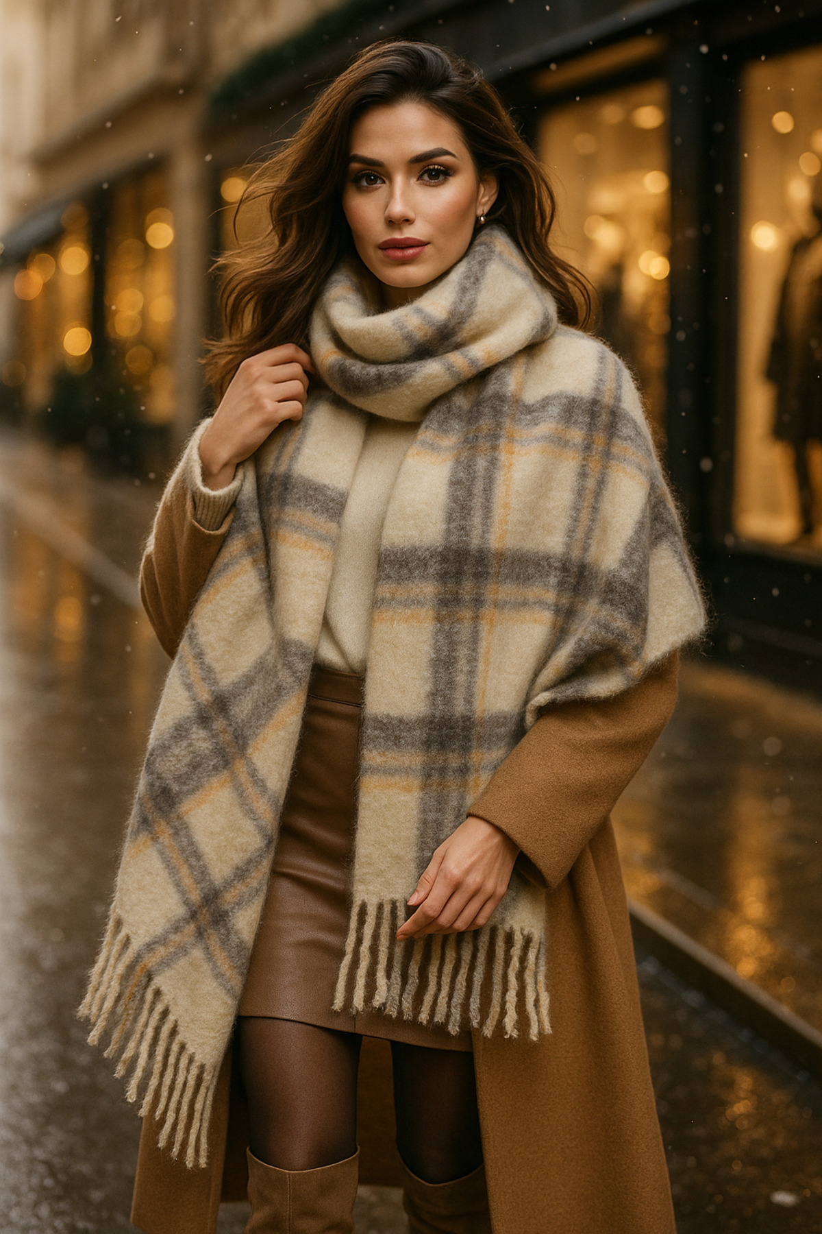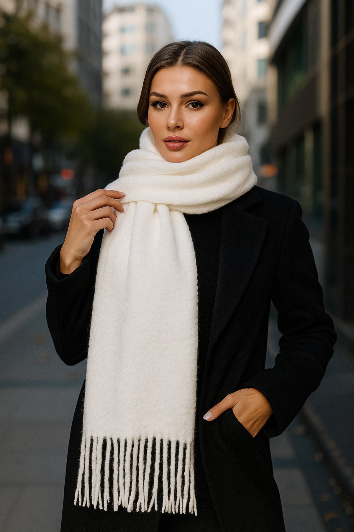 - Zarif püskül detayları ile bej rengin sıcak tonlarını yansıtan, şıklığı ve konforu bir arada sunan kadın atkı-şal.