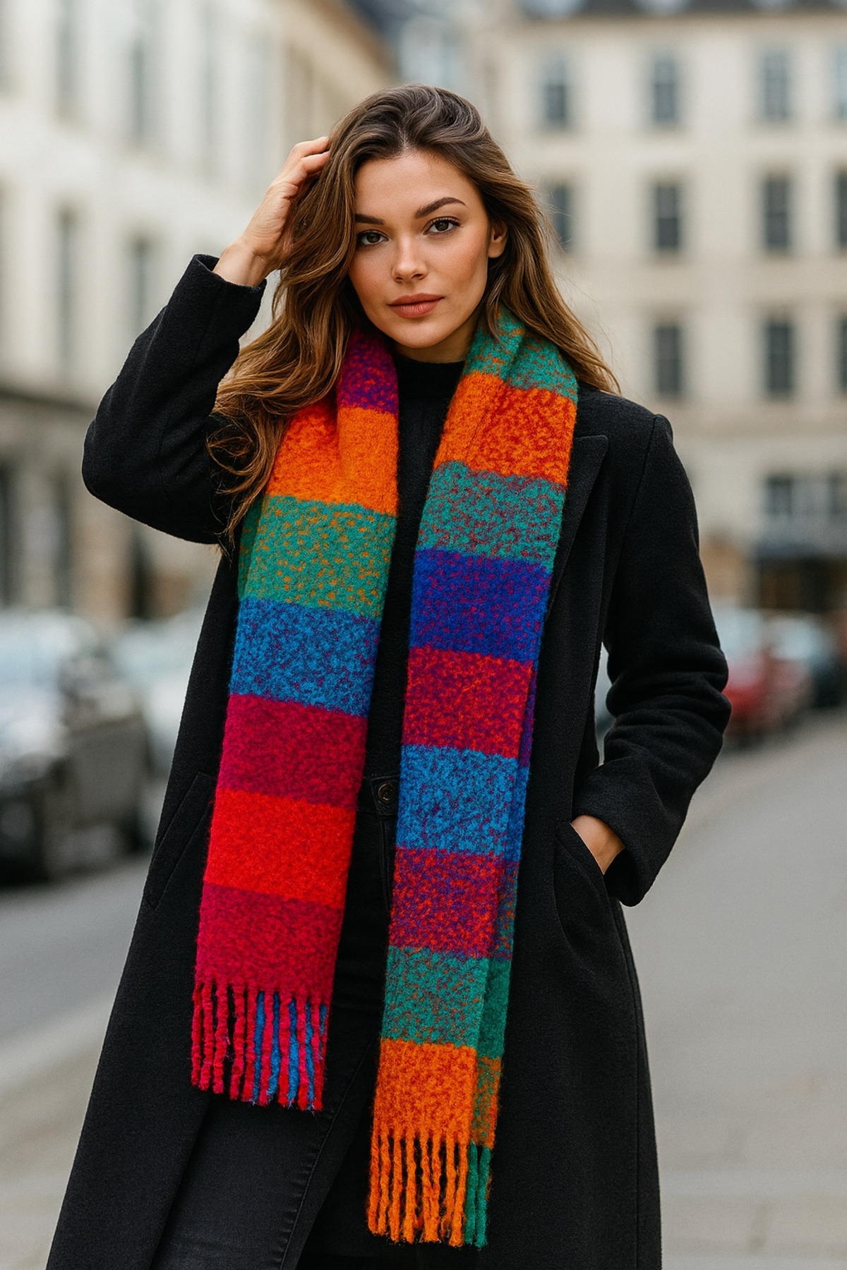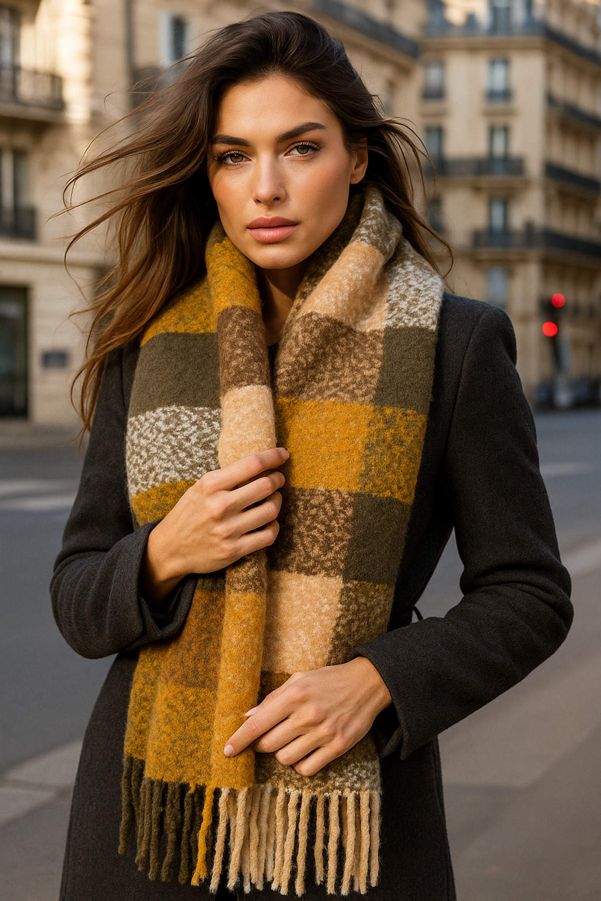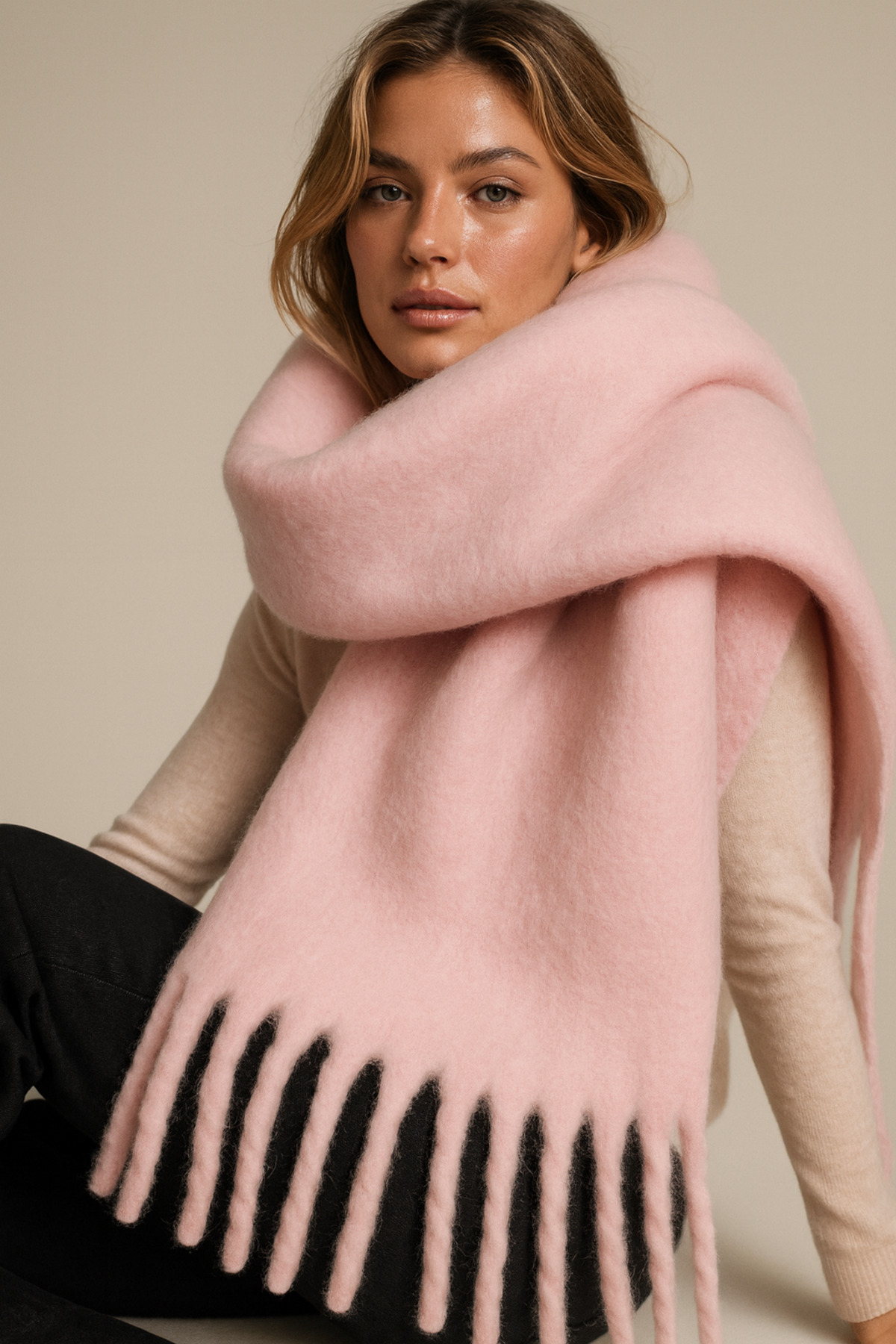 - Zarif püskül detayları ile bej rengin sıcak tonlarını yansıtan, şıklığı ve konforu bir arada sunan kadın atkı-şal.