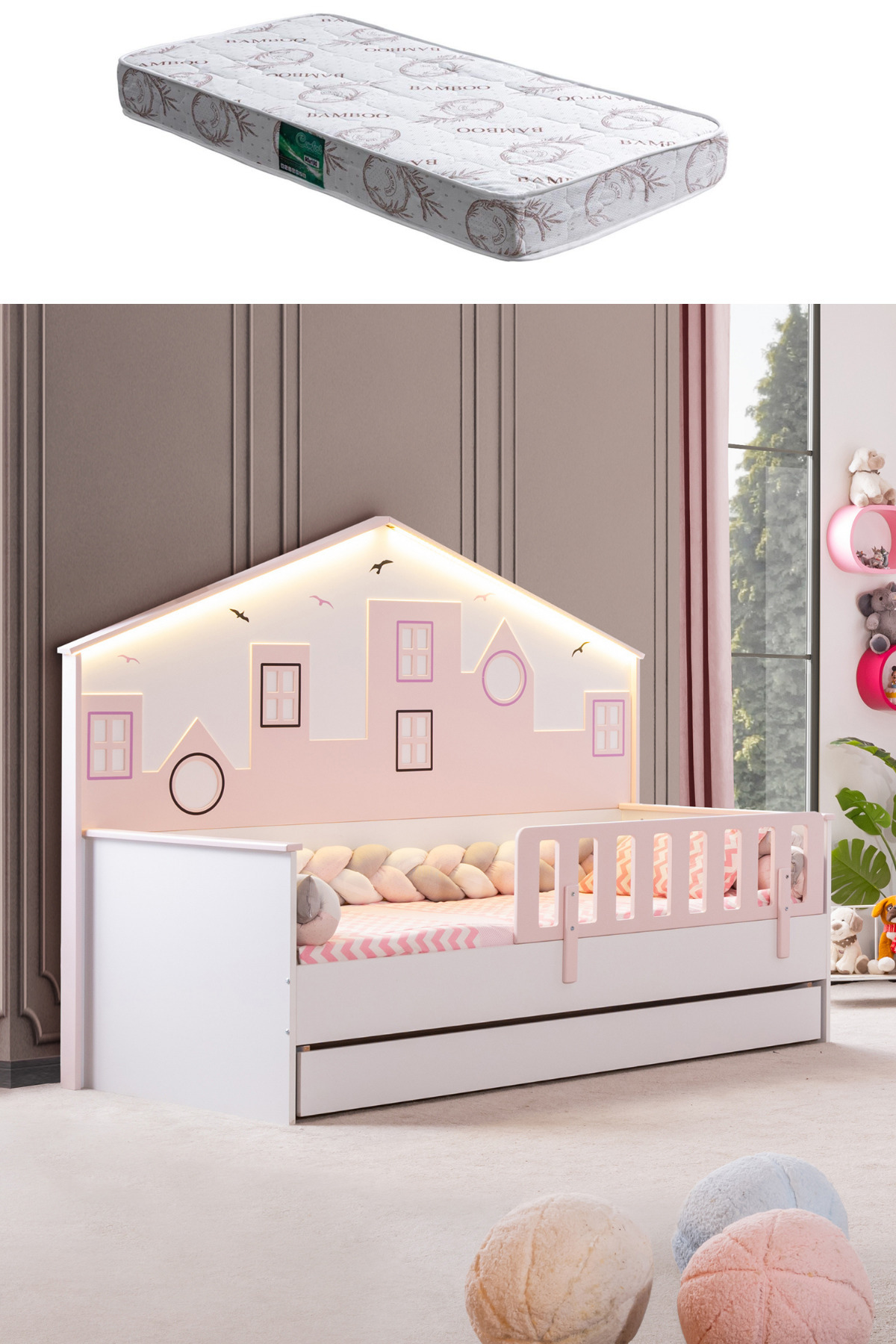 City Yavrulu Montessori Yatak Panolu Korkuluklu + 1 Adet Comfort Yatak