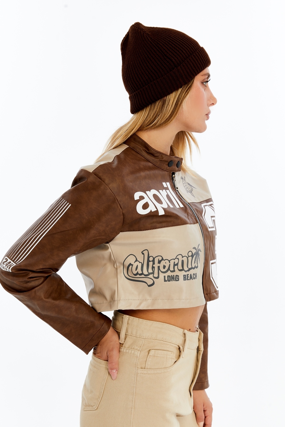 Kadın Crop Deri Ceket – Renkli Baskılı Motorcu Stil Mont - Kısa Ceket Çok Renkli Mont - Hakim Yaka