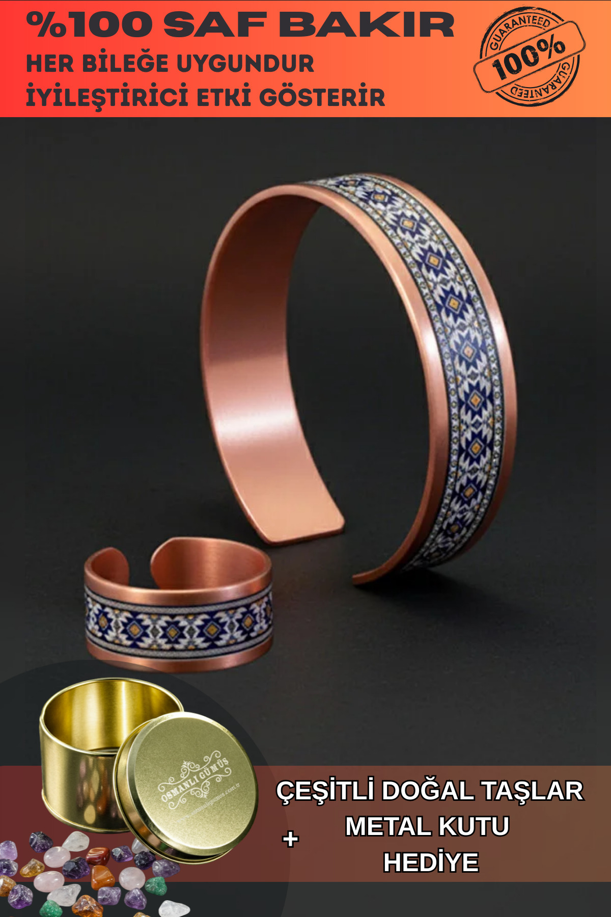 Kadın Bakır Bileklik Yüzük Set - Carlotta Model Özel Baskı Metal Kutu Ve Doğal Taşlar