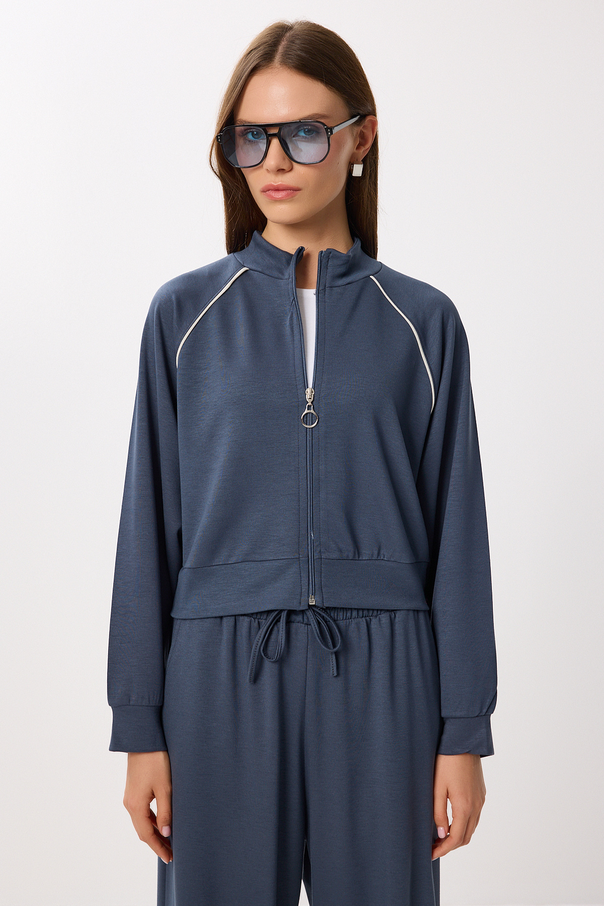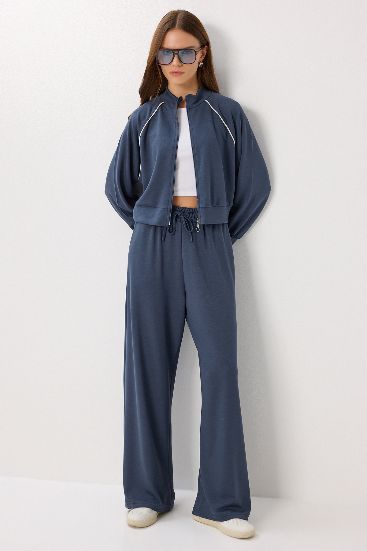 Dik yaka, fermuar kapamalı, crop sweatshirt ve ayarlanabilir elastik bel, yan cepli alttan oluşan modal takımİçerik: %50 Viskon %44 Polyester %6 ElastanÜrün Boyu: 46 cm Kol Boyu: 54 cm Alt Boyu: 106 cm 30° makinede yıkanabilir.
