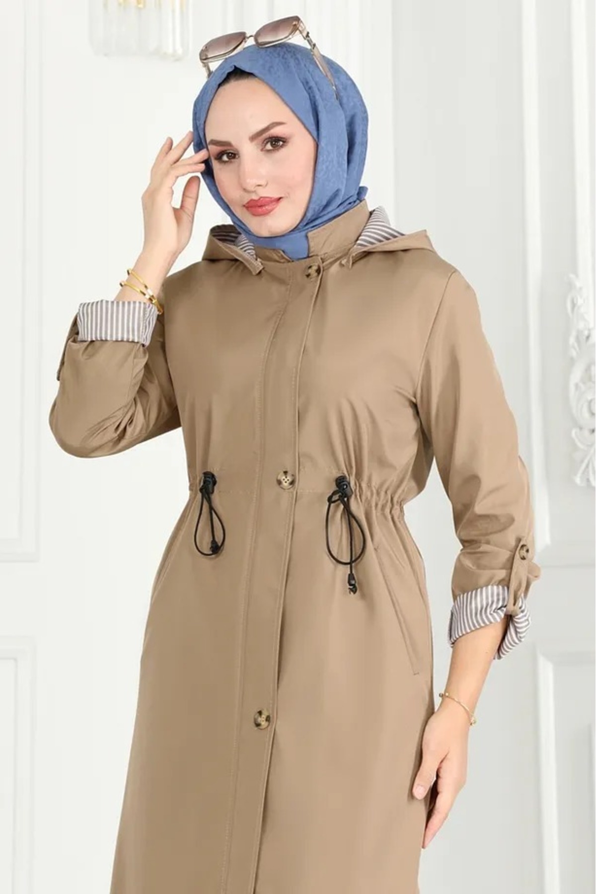 - Bej rengiyle şıklığı ve sadeliği bir arada sunan bu trençkot, her türlü günlük kombinle uyum sağlar.